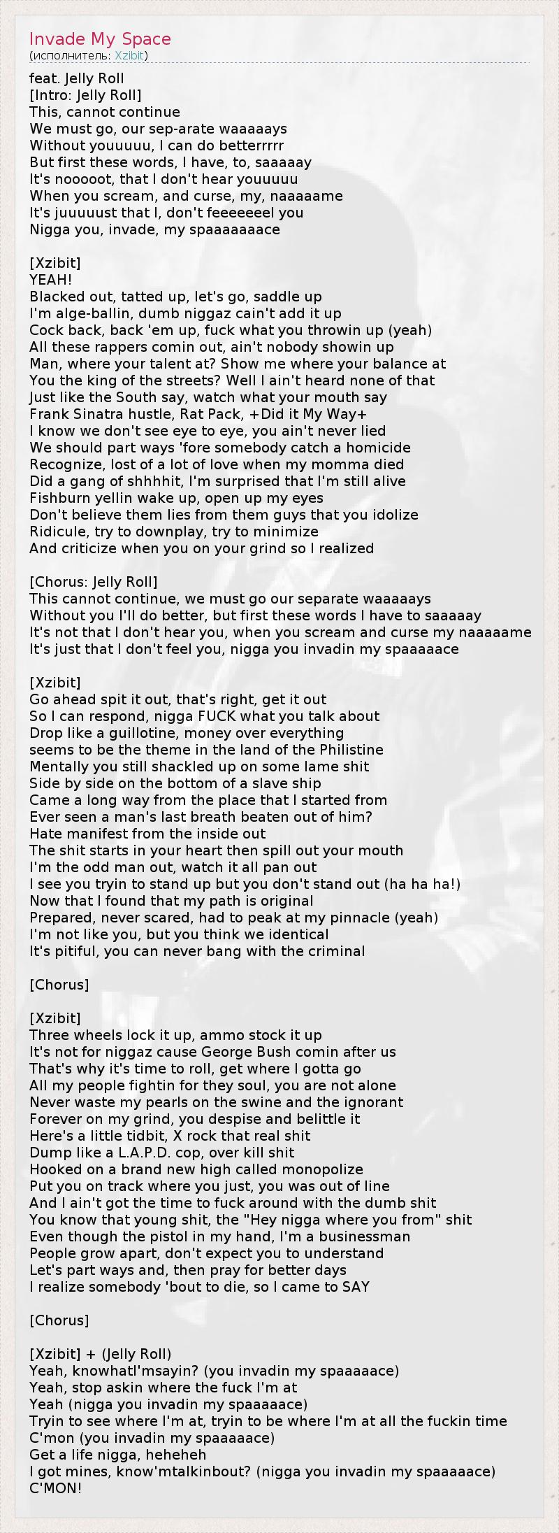 feat. Jelly Roll [Intro: Jelly Roll] This, cannot continue We must go, our sep-arate waaaaays Without youuuuu, I can do betterrrrr But first these words, I have, to, saaaaay It's nooooot, that I don't hear youuuuu When you scream, and curse, my, naaaaame It's juuuuust that I, don't feeeeeeel you Nigga you, invade, my spaaaaaaace [Xzibit] YEAH! Blacked out, tatted up, let's go, saddle up I'm alge-ballin, dumb niggaz cain't add it up Cock back, back 'em up, fuck what you throwin up (yeah) All these rappers comin out, ain't nobody showin up Man, where your talent at? Show me where your balance at You the king of the streets? Well I ain't heard none of that Just like the South say, watch what your mouth say Frank Sinatra hustle, Rat Pack, +Did it My Way+ I know we don't see eye to eye, you ain't never lied We should part ways 'fore somebody catch a homicide Recognize, lost of a lot of love when my momma died Did a gang of shhhhit, I'm surprised that I'm still alive Fishburn yellin wake up, open up my eyes Don't believe them lies from them guys that you idolize Ridicule, try to downplay, try to minimize And criticize when you on your grind so I realized [Chorus: Jelly Roll] This cannot continue, we must go our separate waaaaays Without you I'll do better, but first these words I have to saaaaay It's not that I don't hear you, when you scream and curse my naaaaame It's just that I don't feel you, nigga you invadin my spaaaaace [Xzibit] Go ahead spit it out, that's right, get it out So I can respond, nigga FUCK what you talk about Drop like a guillotine, money over everything seems to be the theme in the land of the Philistine Mentally you still shackled up on some lame shit Side by side on the bottom of a slave ship Came a long way from the place that I started from Ever seen a man's last breath beaten out of him? Hate manifest from the inside out The shit starts in your heart then spill out your mouth I'm the odd man out, watch it all pan out I see you tryin to stand up but you don't stand out (ha ha ha!) Now that I found that my path is original Prepared, never scared, had to peak at my pinnacle (yeah) I'm not like you, but you think we identical It's pitiful, you can never bang with the criminal [Chorus] [Xzibit] Three wheels lock it up, ammo stock it up It's not for niggaz cause George Bush comin after us That's why it's time to roll, get where I gotta go All my people fightin for they soul, you are not alone Never waste my pearls on the swine and the ignorant Forever on my grind, you despise and belittle it Here's a little tidbit, X rock that real shit Dump like a L.A.P.D. cop, over kill shit Hooked on a brand new high called monopolize Put you on track where you just, you was out of line And I ain't got the time to fuck around with the dumb shit You know that young shit, the "Hey nigga where you from" shit Even though the pistol in my hand, I'm a businessman People grow apart, don't expect you to understand Let's part ways and, then pray for better days I realize somebody 'bout to die, so I came to SAY [Chorus] [Xzibit] + (Jelly Roll) Yeah, knowhatI'msayin? (you invadin my spaaaaace) Yeah, stop askin where the fuck I'm at Yeah (nigga you invadin my spaaaaace) Tryin to see where I'm at, tryin to be where I'm at all the fuckin time C'mon (you invadin my spaaaaace) Get a life nigga, heheheh I got mines, know'mtalkinbout? (nigga you invadin my spaaaaace) C'MON!