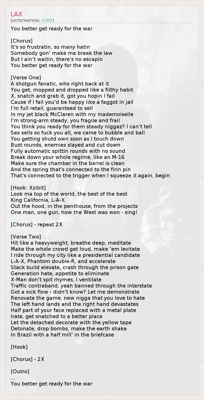 You better get ready for the war [Chorus] It's so frustratin, so many hatin Somebody gon' make me break the law But I ain't waitin, there's no escapin You better get ready for the war [Verse One] A shotgun fanatic, who right back at it You get, mopped and dropped like a filthy habit X, snatch and grab it, got you hopin I fail Cause if I fail you'd be happy like a faggot in jail I'm full retail, guaranteed to sell In my jet black McClaren with my mademoiselle I'm strong-arm steady, you fragile and frail You think you ready for them steady niggaz? I can't tell Sex sells so fuck you all, we came to bubble and ball You getting shutd own soon as I touch down Bust rounds, enemies slayed and cut down Fully automatic spittin rounds with no sound Break down your whole regime, like an M-16 Make sure the chamber in the barrel is clean And the spring that's connected to the firin pin That's connected to the trigger when I squeeze it again, begin [Hook: Xzibit] Look ma top of the world, the best of the best King California, L-A-X Out the hood, in the penthouse, from the projects One man, one gun, how the West was won - sing! [Chorus] - repeat 2X [Verse Two] Hit like a heavyweight, breathe deep, meditate Make the whole crowd get loud, make 'em levitate I ride through my city like a presidential candidate L-A-X, Phantom double-R, and accelerate Stack build elevate, crash through the prison gate Generation hate, appetite to eliminate X-Man don't spit rhymes, I ventilate Traffic contraband, yeah banned through the interstate Got a sick flow - didn't know? Let me demonstrate Renovate the game, new nigga that you love to hate The left hand lands and the right hand devastates Half part of your face replaced with a metal plate Irate, get snatched to a better place Let the detached decorate with the yellow tape Detonate, drop bombs, make the earth shake In Brazil with a half mill' in the briefcase [Hook] [Chorus] - 2X [Outro] ... You better get ready for the war