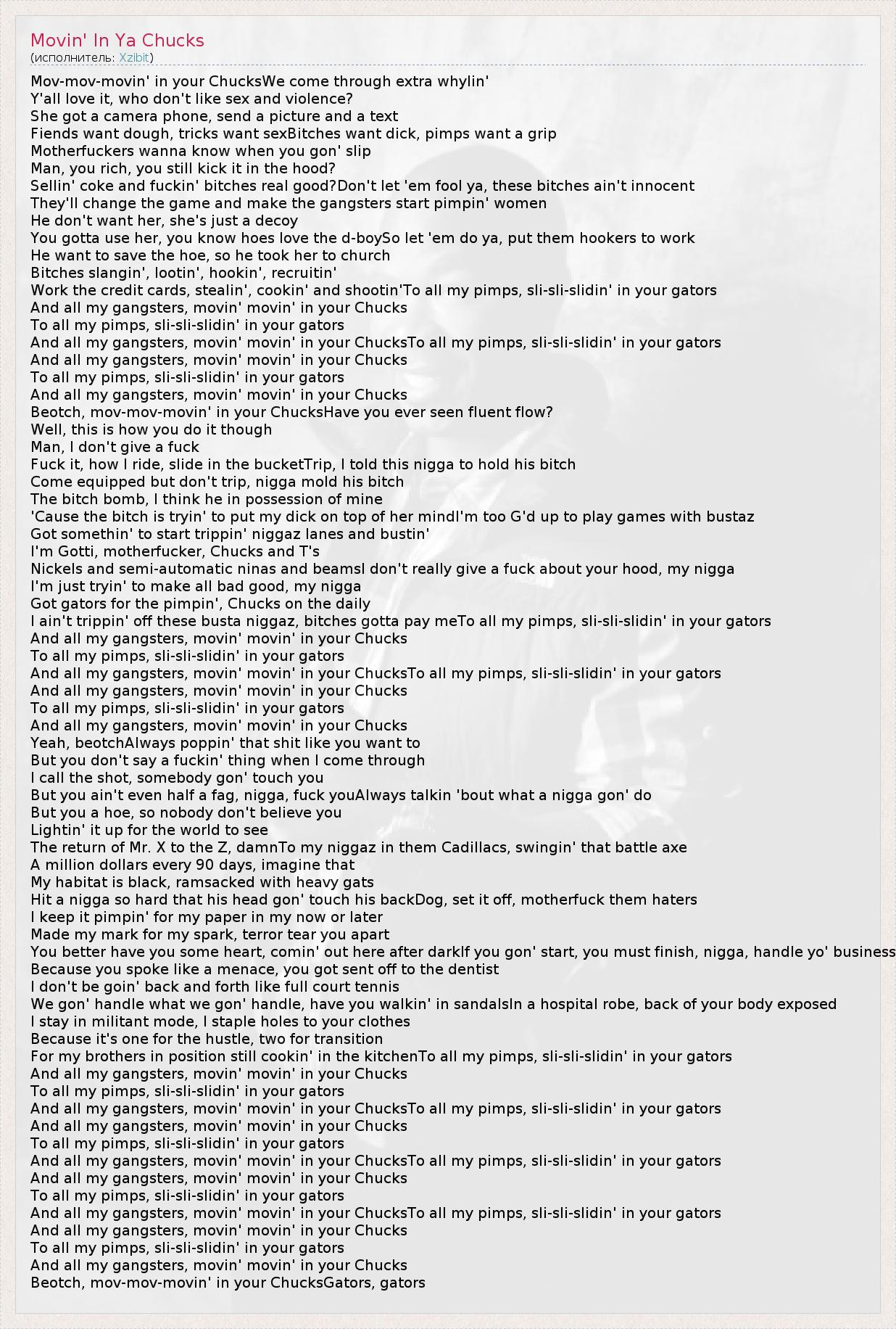 Mov-mov-movin' in your ChucksWe come through extra whylin' Y'all love it, who don't like sex and violence? She got a camera phone, send a picture and a text Fiends want dough, tricks want sexBitches want dick, pimps want a grip Motherfuckers wanna know when you gon' slip Man, you rich, you still kick it in the hood? Sellin' coke and fuckin' bitches real good?Don't let 'em fool ya, these bitches ain't innocent They'll change the game and make the gangsters start pimpin' women He don't want her, she's just a decoy You gotta use her, you know hoes love the d-boySo let 'em do ya, put them hookers to work He want to save the hoe, so he took her to church Bitches slangin', lootin', hookin', recruitin' Work the credit cards, stealin', cookin' and shootin'To all my pimps, sli-sli-slidin' in your gators And all my gangsters, movin' movin' in your Chucks To all my pimps, sli-sli-slidin' in your gators And all my gangsters, movin' movin' in your ChucksTo all my pimps, sli-sli-slidin' in your gators And all my gangsters, movin' movin' in your Chucks To all my pimps, sli-sli-slidin' in your gators And all my gangsters, movin' movin' in your Chucks Beotch, mov-mov-movin' in your ChucksHave you ever seen fluent flow? Well, this is how you do it though Man, I don't give a fuck Fuck it, how I ride, slide in the bucketTrip, I told this nigga to hold his bitch Come equipped but don't trip, nigga mold his bitch The bitch bomb, I think he in possession of mine 'Cause the bitch is tryin' to put my dick on top of her mindI'm too G'd up to play games with bustaz Got somethin' to start trippin' niggaz lanes and bustin' I'm Gotti, motherfucker, Chucks and T's Nickels and semi-automatic ninas and beamsI don't really give a fuck about your hood, my nigga I'm just tryin' to make all bad good, my nigga Got gators for the pimpin', Chucks on the daily I ain't trippin' off these busta niggaz, bitches gotta pay meTo all my pimps, sli-sli-slidin' in your gators And all my gangsters, movin' movin' in your Chucks To all my pimps, sli-sli-slidin' in your gators And all my gangsters, movin' movin' in your ChucksTo all my pimps, sli-sli-slidin' in your gators And all my gangsters, movin' movin' in your Chucks To all my pimps, sli-sli-slidin' in your gators And all my gangsters, movin' movin' in your Chucks Yeah, beotchAlways poppin' that shit like you want to But you don't say a fuckin' thing when I come through I call the shot, somebody gon' touch you But you ain't even half a fag, nigga, fuck youAlways talkin 'bout what a nigga gon' do But you a hoe, so nobody don't believe you Lightin' it up for the world to see The return of Mr. X to the Z, damnTo my niggaz in them Cadillacs, swingin' that battle axe A million dollars every 90 days, imagine that My habitat is black, ramsacked with heavy gats Hit a nigga so hard that his head gon' touch his backDog, set it off, motherfuck them haters I keep it pimpin' for my paper in my now or later Made my mark for my spark, terror tear you apart You better have you some heart, comin' out here after darkIf you gon' start, you must finish, nigga, handle yo' business Because you spoke like a menace, you got sent off to the dentist I don't be goin' back and forth like full court tennis We gon' handle what we gon' handle, have you walkin' in sandalsIn a hospital robe, back of your body exposed I stay in militant mode, I staple holes to your clothes Because it's one for the hustle, two for transition For my brothers in position still cookin' in the kitchenTo all my pimps, sli-sli-slidin' in your gators And all my gangsters, movin' movin' in your Chucks To all my pimps, sli-sli-slidin' in your gators And all my gangsters, movin' movin' in your ChucksTo all my pimps, sli-sli-slidin' in your gators And all my gangsters, movin' movin' in your Chucks To all my pimps, sli-sli-slidin' in your gators And all my gangsters, movin' movin' in your ChucksTo all my pimps, sli-sli-slidin' in your gators And all my gangsters, movin' movin' in your Chucks To all my pimps, sli-sli-slidin' in your gators And all my gangsters, movin' movin' in your ChucksTo all my pimps, sli-sli-slidin' in your gators And all my gangsters, movin' movin' in your Chucks To all my pimps, sli-sli-slidin' in your gators And all my gangsters, movin' movin' in your Chucks Beotch, mov-mov-movin' in your ChucksGators, gators