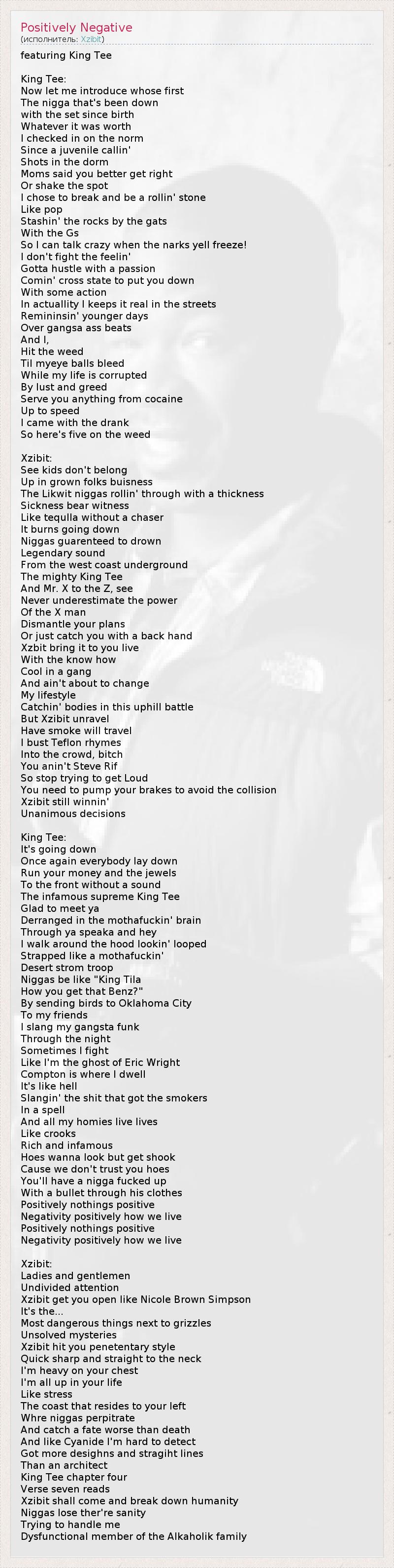 featuring King Tee King Tee: Now let me introduce whose first The nigga that's been down with the set since birth Whatever it was worth I checked in on the norm Since a juvenile callin' Shots in the dorm Moms said you better get right Or shake the spot I chose to break and be a rollin' stone Like pop Stashin' the rocks by the gats With the Gs So I can talk crazy when the narks yell freeze! I don't fight the feelin' Gotta hustle with a passion Comin' cross state to put you down With some action In actuallity I keeps it real in the streets Remininsin' younger days Over gangsa ass beats And I, Hit the weed Til myeye balls bleed While my life is corrupted By lust and greed Serve you anything from cocaine Up to speed I came with the drank So here's five on the weed Xzibit: See kids don't belong Up in grown folks buisness The Likwit niggas rollin' through with a thickness Sickness bear witness Like tequlla without a chaser It burns going down Niggas guarenteed to drown Legendary sound From the west coast underground The mighty King Tee And Mr. X to the Z, see Never underestimate the power Of the X man Dismantle your plans Or just catch you with a back hand Xzbit bring it to you live With the know how Cool in a gang And ain't about to change My lifestyle Catchin' bodies in this uphill battle But Xzibit unravel Have smoke will travel I bust Teflon rhymes Into the crowd, bitch You anin't Steve Rif So stop trying to get Loud You need to pump your brakes to avoid the collision Xzibit still winnin' Unanimous decisions King Tee: It's going down Once again everybody lay down Run your money and the jewels To the front without a sound The infamous supreme King Tee Glad to meet ya Derranged in the mothafuckin' brain Through ya speaka and hey I walk around the hood lookin' looped Strapped like a mothafuckin' Desert strom troop Niggas be like "King Tila How you get that Benz?" By sending birds to Oklahoma City To my friends I slang my gangsta funk Through the night Sometimes I fight Like I'm the ghost of Eric Wright Compton is where I dwell It's like hell Slangin' the shit that got the smokers In a spell And all my homies live lives Like crooks Rich and infamous Hoes wanna look but get shook Cause we don't trust you hoes You'll have a nigga fucked up With a bullet through his clothes Positively nothings positive Negativity positively how we live Positively nothings positive Negativity positively how we live Xzibit: Ladies and gentlemen Undivided attention Xzibit get you open like Nicole Brown Simpson It's the... Most dangerous things next to grizzles Unsolved mysteries Xzibit hit you penetentary style Quick sharp and straight to the neck I'm heavy on your chest I'm all up in your life Like stress The coast that resides to your left Whre niggas perpitrate And catch a fate worse than death And like Cyanide I'm hard to detect Got more desighns and stragiht lines Than an architect King Tee chapter four Verse seven reads Xzibit shall come and break down humanity Niggas lose ther're sanity Trying to handle me Dysfunctional member of the Alkaholik family