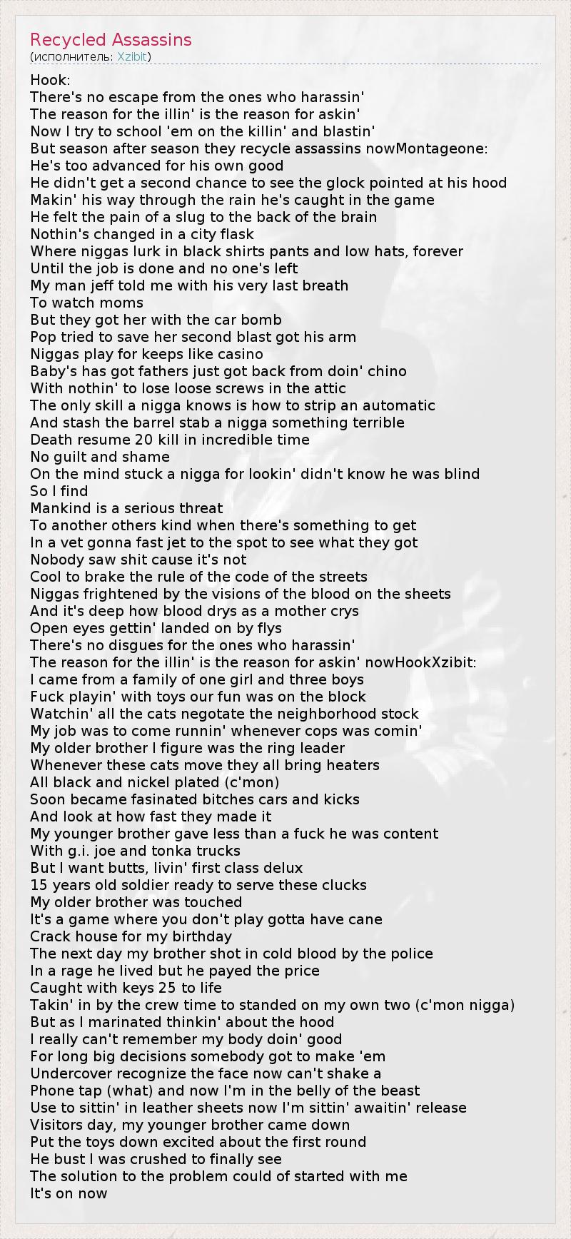 Hook: There's no escape from the ones who harassin' The reason for the illin' is the reason for askin' Now I try to school 'em on the killin' and blastin' But season after season they recycle assassins nowMontageone: He's too advanced for his own good He didn't get a second chance to see the glock pointed at his hood Makin' his way through the rain he's caught in the game He felt the pain of a slug to the back of the brain Nothin's changed in a city flask Where niggas lurk in black shirts pants and low hats, forever Until the job is done and no one's left My man jeff told me with his very last breath To watch moms But they got her with the car bomb Pop tried to save her second blast got his arm Niggas play for keeps like casino Baby's has got fathers just got back from doin' chino With nothin' to lose loose screws in the attic The only skill a nigga knows is how to strip an automatic And stash the barrel stab a nigga something terrible Death resume 20 kill in incredible time No guilt and shame On the mind stuck a nigga for lookin' didn't know he was blind So I find Mankind is a serious threat To another others kind when there's something to get In a vet gonna fast jet to the spot to see what they got Nobody saw shit cause it's not Cool to brake the rule of the code of the streets Niggas frightened by the visions of the blood on the sheets And it's deep how blood drys as a mother crys Open eyes gettin' landed on by flys There's no disgues for the ones who harassin' The reason for the illin' is the reason for askin' nowHookXzibit: I came from a family of one girl and three boys Fuck playin' with toys our fun was on the block Watchin' all the cats negotate the neighborhood stock My job was to come runnin' whenever cops was comin' My older brother I figure was the ring leader Whenever these cats move they all bring heaters All black and nickel plated (c'mon) Soon became fasinated bitches cars and kicks And look at how fast they made it My younger brother gave less than a fuck he was content With g.i. joe and tonka trucks But I want butts, livin' first class delux 15 years old soldier ready to serve these clucks My older brother was touched It's a game where you don't play gotta have cane Crack house for my birthday The next day my brother shot in cold blood by the police In a rage he lived but he payed the price Caught with keys 25 to life Takin' in by the crew time to standed on my own two (c'mon nigga) But as I marinated thinkin' about the hood I really can't remember my body doin' good For long big decisions somebody got to make 'em Undercover recognize the face now can't shake a Phone tap (what) and now I'm in the belly of the beast Use to sittin' in leather sheets now I'm sittin' awaitin' release Visitors day, my younger brother came down Put the toys down excited about the first round He bust I was crushed to finally see The solution to the problem could of started with me It's on now
