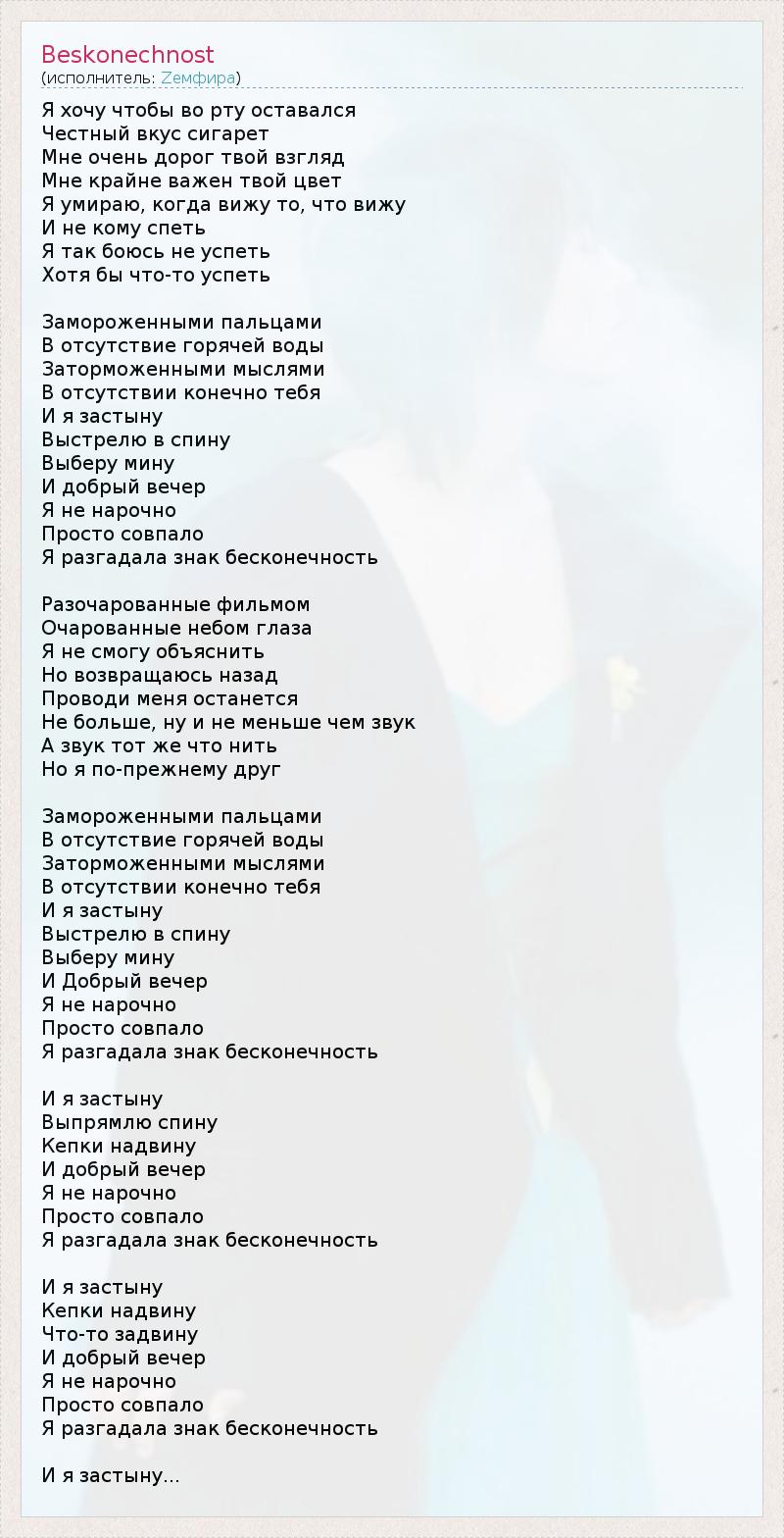 Я хочу чтобы во рту оставался Честный вкус сигарет Мне очень дорог твой взгляд Мне крайне важен твой цвет Я умираю, когда вижу то, что вижу И не кому спеть Я так боюсь не успеть Хотя бы что-то успеть Замороженными пальцами В отсутствие горячей воды Заторможенными мыслями В отсутствии конечно тебя И я застыну Выстрелю в спину Выберу мину И добрый вечер Я не нарочно Просто совпало Я разгадала знак бесконечность Разочарованные фильмом Очарованные небом глаза Я не смогу объяснить Но возвращаюсь назад Проводи меня останется Не больше, ну и не меньше чем звук А звук тот же что нить Но я по-прежнему друг Замороженными пальцами В отсутствие горячей воды Заторможенными мыслями В отсутствии конечно тебя И я застыну Выстрелю в спину Выберу мину И Добрый вечер Я не нарочно Просто совпало Я разгадала знак бесконечность И я застыну Выпрямлю спину Кепки надвину И добрый вечер Я не нарочно Просто совпало Я разгадала знак бесконечность И я застыну Кепки надвину Что-то задвину И добрый вечер Я не нарочно Просто совпало Я разгадала знак бесконечность И я застыну...