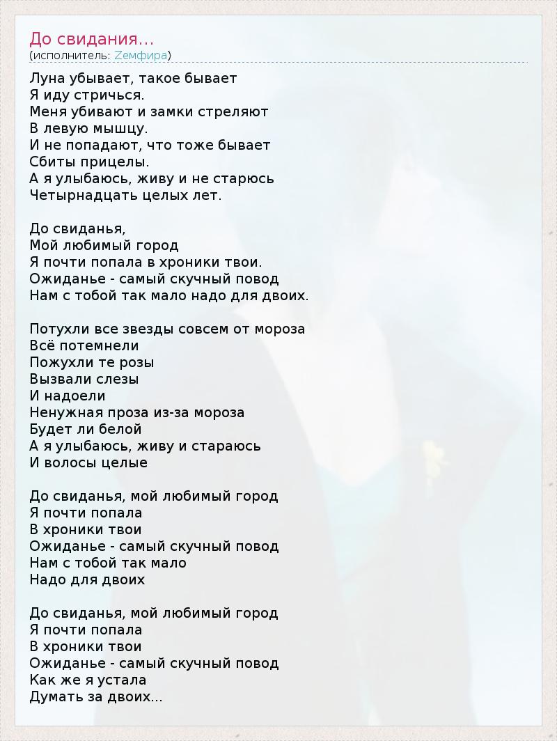 Луна убывает, такое бывает Я иду стричься. Меня убивают и замки стреляют В левую мышцу. И не попадают, что тоже бывает Сбиты прицелы. А я улыбаюсь, живу и не старюсь Четырнадцать целых лет. До свиданья, Мой любимый город Я почти попала в хроники твои. Ожиданье - самый скучный повод Нам с тобой так мало надо для двоих. Потухли все звезды совсем от мороза Всё потемнели Пожухли те розы Вызвали слезы И надоели Ненужная проза из-за мороза Будет ли белой А я улыбаюсь, живу и стараюсь И волосы целые До свиданья, мой любимый город Я почти попала В хроники твои Ожиданье - самый скучный повод Нам с тобой так мало Надо для двоих До свиданья, мой любимый город Я почти попала В хроники твои Ожиданье - самый скучный повод Как же я устала Думать за двоих...