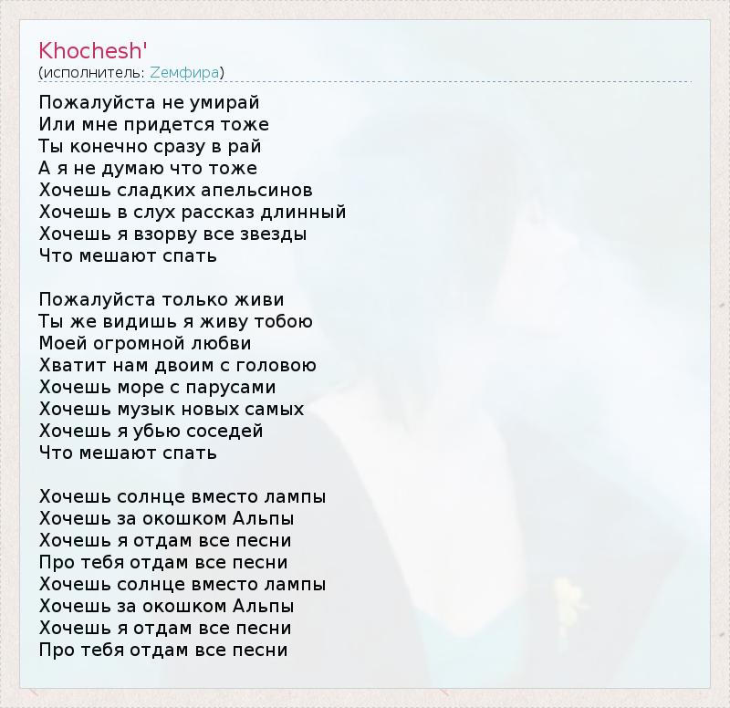Текст песни Земфира "Хочешь?" пожалуйста, не умирай, или мне придется тоже. ты, конечно, сразу в рай, а я не думаю, что тоже. хочешь сладких апельсинов? хочешь вслух рассказов длинных? хочешь я взорву все звезды, что мешают спать? пожалуйста, только живи, ты же видишь, я живу тобою, моей огромной любви хватит нам двоим с головою. хочешь в море с парусами? хочешь музык новых самых? хочешь я убью соседей, что мешают спать? хочешь, солнце вместо лампы? Хочешь за окошком Альпы? Хочешь, я отдам все песни, про тебя отдам все песни я?
