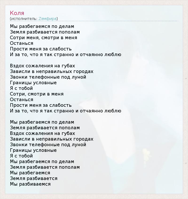 ЗЕМФИРА Мы разбегаемся по делам Земля разбивается пополам Сотри меня, смотри в меня Останься Прости меня за слабость И за то, что я так странно и отчаянно люблю Вздох сожаления на губах Зависли в неправильных городах Звонки телефонные под луной Границы условные Я с тобой Сотри, смотри в меня Останься Прости меня за слабость И за то, что я так странно и отчаянно люблю Мы разбегаемся по делам Земля разбивается пополам Вздох сожаления на губах Зависли в неправильных городах Звонки телефонные под луной Границы условные Я с тобой Мы разбегаемся по делам Земля разбивается пополам Мы разбегаемся Земля разбивается Мы разбиваемся
