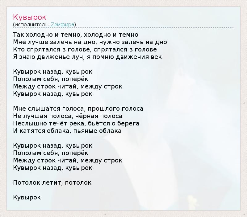 В альбом вошли десять песен: "Жить в твоей голове", "Без шансов", "Деньги", "Кофевино", "Чайка", "Если бы", "Похоронила", "Река", "Кувырок", "Гора". Певица включила в пластинку обнародованные ею ранее песни "Без шансов" и "Деньги", а также композицию "Похоронила", вошедшую в саундтрек к фильму Ренаты Литвиновой "Последняя сказка Риты". Другие композиции с альбома представлены впервые.