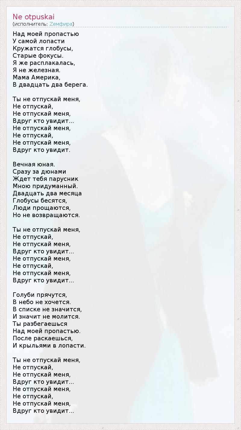 Над моей пропастью У самой лопасти Кружатся глобусы, Старые фокусы. Я же расплакалась, Я не железная. Мама Америка, В двадцать два берега. Ты не отпускай меня, Не отпускай, Не отпускай меня, Вдруг кто увидит... Не отпускай меня, Не отпускай, Не отпускай меня, Вдруг кто увидит. Вечная юная. Сразу за дюнами Ждет тебя парусник Мною придуманный. Двадцать два месяца Глобусы бесятся, Люди прощаются, Но не возвращаются. Ты не отпускай меня, Не отпускай, Не отпускай меня, Вдруг кто увидит... Не отпускай меня, Не отпускай, Не отпускай меня, Вдруг кто увидит... Голуби прячутся, В небо не хочется. В списке не значится, И значит не молится. Ты разбегаешься Над моей пропастью. После раскаешься, И крыльями в лопасти. Ты не отпускай меня, Не отпускай, Не отпускай меня, Вдруг кто увидит... Не отпускай меня, Не отпускай, Не отпускай меня, Вдруг кто увидит...