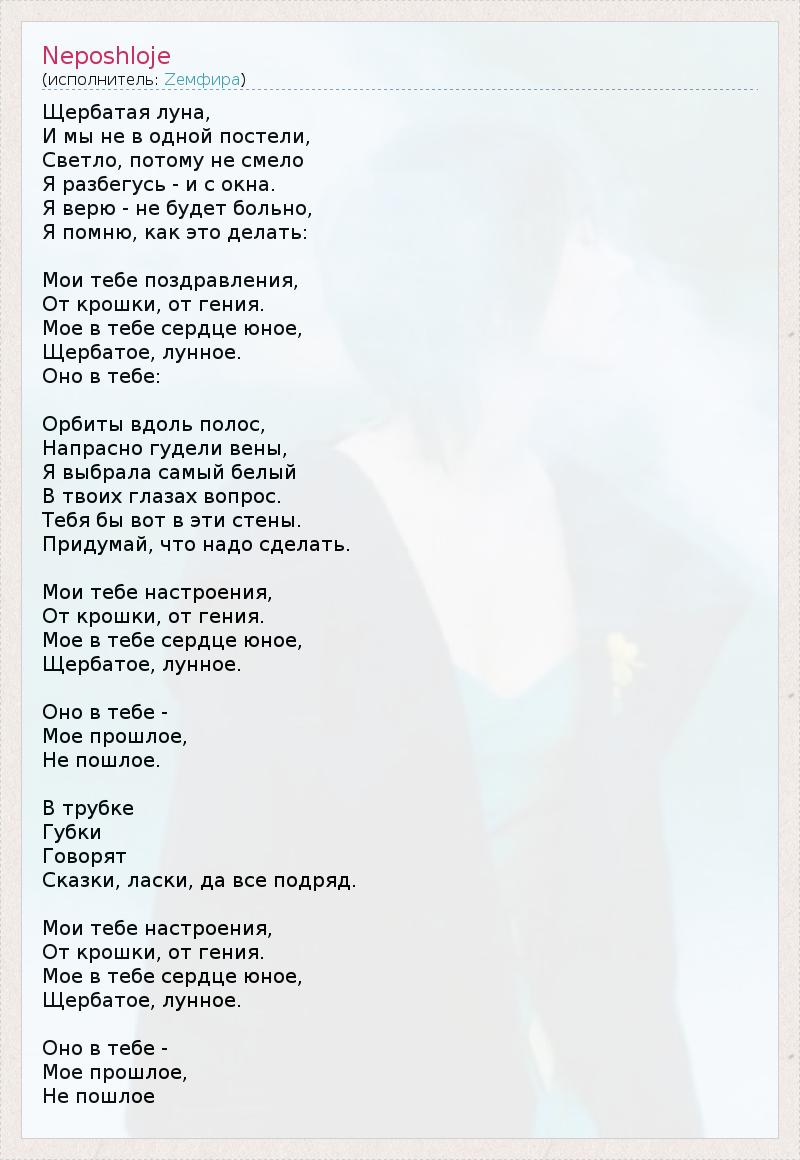 Щербатая луна, И мы не в одной постели, Светло, потому не смело Я разбегусь - и с окна. Я верю - не будет больно, Я помню, как это делать: Мои тебе поздравления, От крошки, от гения. Мое в тебе сердце юное, Щербатое, лунное. Оно в тебе: Орбиты вдоль полос, Напрасно гудели вены, Я выбрала самый белый В твоих глазах вопрос. Тебя бы вот в эти стены. Придумай, что надо сделать. Мои тебе настроения, От крошки, от гения. Мое в тебе сердце юное, Щербатое, лунное. Оно в тебе - Мое прошлое, Не пошлое. В трубке Губки Говорят Сказки, ласки, да все подряд. Мои тебе настроения, От крошки, от гения. Мое в тебе сердце юное, Щербатое, лунное. Оно в тебе - Мое прошлое, Не пошлое