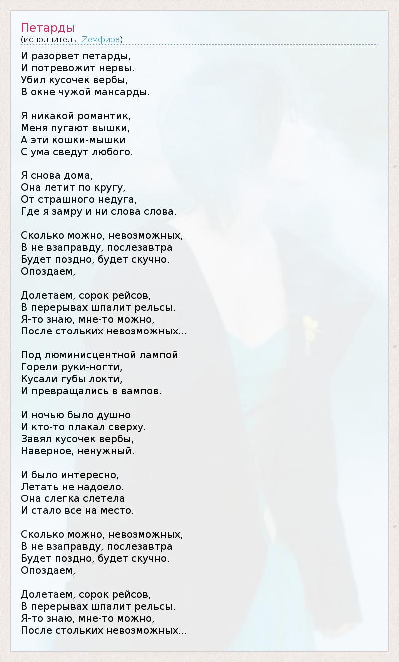 Это интересно:Земфи́ра Талга́товна Рамаза́нова (26 августа 1976, Уфа) — российская певица, музыкант, композитор и автор песен, выступающая под сценическим именем Земфира. Одна из самых коммерчески успешных исполнительниц в истории российской музыки. Известна своими музыкальными достижениями, вокальными способностями. Земфира стала олицетворением нового движения в русском роке, которое журналисты... продолжение