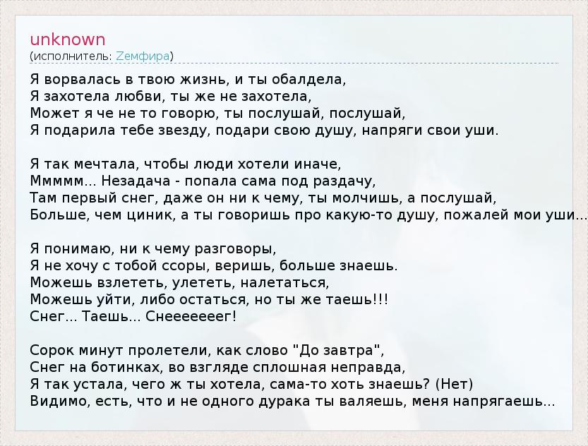 Я ворвалась в твою жизнь, и ты обалдела, Я захотела любви, ты же не захотела, Может я че не то говорю, ты послушай, послушай, Я подарила тебе звезду, подари свою душу, напряги свои уши. Я так мечтала, чтобы люди хотели иначе, Ммммм... Hезадача - попала сама под раздачу, Там первый снег, даже он ни к чему, ты молчишь, а послушай, Больше, чем циник, а ты говоришь про какую-то душу, пожалей мои уши... Я понимаю, ни к чему разговоры, Я не хочу с тобой ссоры, веришь, больше знаешь. Можешь взлететь, улететь, налетаться, Можешь уйти, либо остаться, но ты же таешь!!! Снег... Таешь... Снееееееег! Сорок минут пролетели, как слово "До завтра", Снег на ботинках, во взгляде сплошная неправда, Я так устала, чего ж ты хотела, сама-то хоть знаешь? (Hет) Видимо, есть, что и не одного дурака ты валяешь, меня напрягаешь...