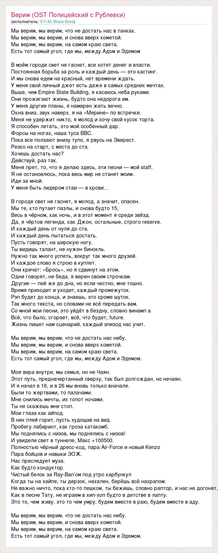 Мы верим, мы верим, что не достать нас в танках. Мы верим, мы верим, и снова вверх кометой. Мы верим, мы верим, на самом краю света. Есть тот самый угол, где мы, между Адом и Эдемом В моём городе свет не гаснет, все хотят денег и власти. Постоянная борьба за роль и каждый день — это кастинг. И мы снова едем на красный, нет времени ждать. У меня свой личный джет есть даже в самых средних мечтах. Выше, чем Empire State Building, я касаюсь неба руками. Они прожигают жизнь, будто она недорога им. У меня другие планы, я намерен жить вечно. Окна вниз, звук наверх, я на «Мерине» по встречке. Меня не удержит никто, я молод и хочу свой кусок торта. Я способен летать, это мой особенный дар. Форсы на ногах, наша туса ВВС. Пока все ползают внизу тупо, я рвусь на Эверест. Резко на старт, с места до ста. Хочешь достать нас? Действуй, раз так. Меня прет, то, что я делаю здесь, эти песни — мой staff. Я не остановлюсь, пока весь мир не станет моим. Иди за мной. У меня быть лидером стаи — в крови… В городе свет не гаснет, я молод, а значит, опасен. Мы те, кто путает пазлы, и снова будто 15, Весь в чёрном, как ночь, и в этот момент я среди звёзд. Да, я чёртов легенда, как Джон, остальные, строго reserve. И каждый день от нуля до ста. И каждый день пытаться достать. Пусть говорят, на широкую ногу. Ты видишь талант, не нужен бинокль. Нужно так много успеть, вокруг так много друзей. И каждое слово я строю в куплет. Они кричат: «Брось», но я сдвинут на этом. Одни говорят, не беда, я верен своим строчкам. Другие — пей же до дна, но если честно, мне тошно. Время приходит и уходит, каждый промежуток. Рэп будет до конца, и знаешь, это кроме шуток. Так много текста, но словами не всё передать вам. Со мной мои песни, это уйдёт в бездну, словно винамп а Всё, что было, сгорает, всё, что будет, future. Жизнь пишет нам сценарий, каждый эпизод нас учит. Мы верим, мы верим, что не достать нас небу. Мы верим, мы верим, и снова вверх кометой. Мы верим, мы верим, на самом краю света. Есть тот самый угол, где мы, между Адом и Эдемом. Моя вера внутри, мы семья, но не Чаян. Этот путь, предначертанный сверху, так был долгождан, но нечаян. И я начал в 16, и в 26 мы вновь только вначале. Были то жертвами, то палачами. Мне снились мечты, их топот ночами. Ты не скажешь мне стоп. Мои глаза как айпод. В них плей горит, пусть худощав на вид. Пробегу лабиринт, как гроза катакомб. Мы поднялись с низов, мы поднялись с низов! И увидели свет в туннеле, Макс +100500. Полностью чёрный дресс-код, пара Air-Force и новый Kenzo Пара бойцов и навыки ЗОЖ. Нас преследует муза. Как будто кондуктор. Чистый белок за Ray-Ban’ом под утро карбункул Когда ты на хайпе, ты дерзок, нахален, берёшь всё нахрапом. Не важно ничто, пока кто-то пешком, ты бежишь, словно раптор, и нас не догонят. Как в песне Тату, не играем в хип-хоп будто в детстве в лапту. Это то, чем живу, это то чем умру, будем вместе в раю, будем вместе в аду. Мы верим, мы верим, что не достать нас небу. Мы верим, мы верим, и снова вверх кометой. Мы верим, мы верим, на самом краю света. Есть тот самый угол, где мы, между Адом и Эдемом.