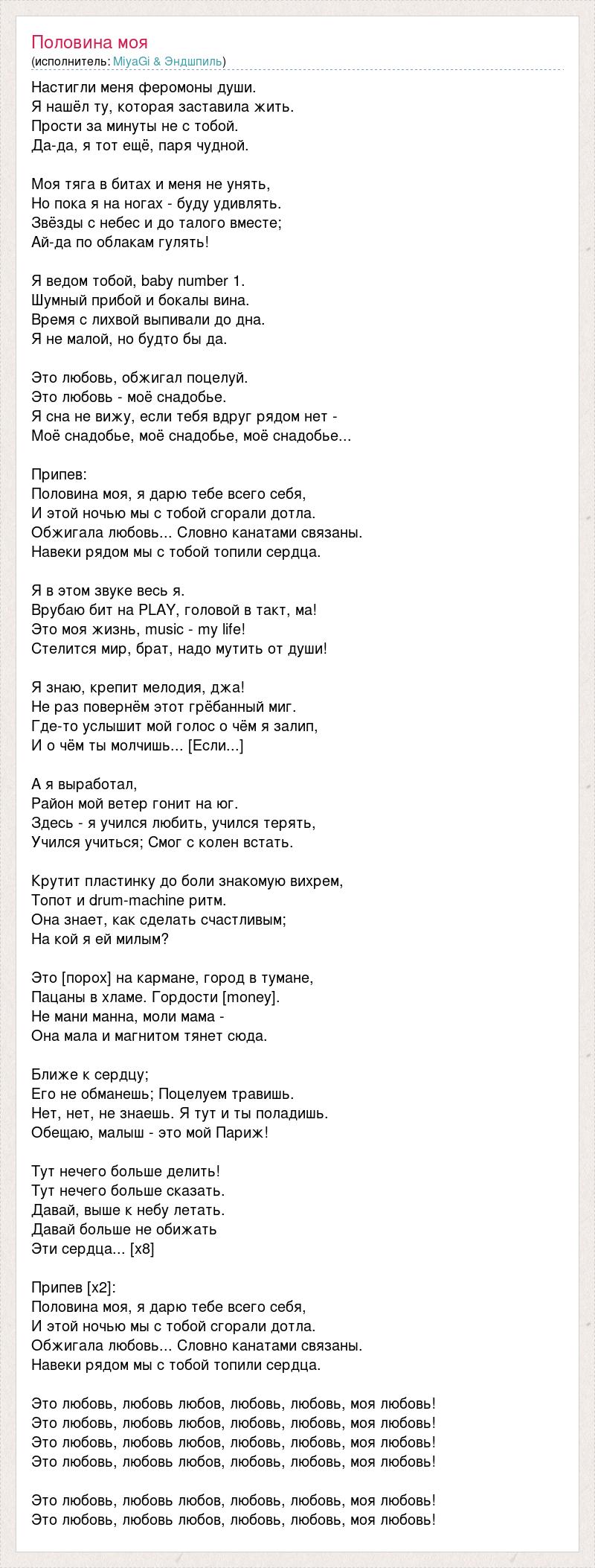 Настигли меня феромоны души. Я нашёл ту, которая заставила жить. Прости за минуты не с тобой. Да-да, я тот ещё, паря чудной. Моя тяга в битах и меня не унять, Но пока я на ногах - буду удивлять. Звёзды с небес и до талого вместе; Ай-да по облакам гулять! Я ведом тобой, baby number 1. Шумный прибой и бокалы вина. Время с лихвой выпивали до дна. Я не малой, но будто бы да. Это любовь, обжигал поцелуй. Это любовь - моё снадобье. Я сна не вижу, если тебя вдруг рядом нет - Моё снадобье, моё снадобье, моё снадобье... Припев: Половина моя, я дарю тебе всего себя, И этой ночью мы с тобой сгорали дотла. Обжигала любовь... Словно канатами связаны. Навеки рядом мы с тобой топили сердца. Я в этом звуке весь я. Врубаю бит на PLAY, головой в такт, ма! Это моя жизнь, music - my life! Стелится мир, брат, надо мутить от души! Я знаю, крепит мелодия, джа! Не раз повернём этот грёбанный миг. Где-то услышит мой голос о чём я залип, И о чём ты молчишь... [Если...] А я выработал, Район мой ветер гонит на юг. Здесь - я учился любить, учился терять, Учился учиться; Смог с колен встать. Крутит пластинку до боли знакомую вихрем, Топот и drum-machine ритм. Она знает, как сделать счастливым; На кой я ей милым? Это [порох] на кармане, город в тумане, Пацаны в хламе. Гордости [money]. Не мани манна, моли мама - Она мала и магнитом тянет сюда. Ближе к сердцу; Его не обманешь; Поцелуем травишь. Нет, нет, не знаешь. Я тут и ты поладишь. Обещаю, малыш - это мой Париж! Тут нечего больше делить! Тут нечего больше сказать. Давай, выше к небу летать. Давай больше не обижать Эти сердца... [x8] Припев [x2]: Половина моя, я дарю тебе всего себя, И этой ночью мы с тобой сгорали дотла. Обжигала любовь... Словно канатами связаны. Навеки рядом мы с тобой топили сердца. Это любовь, любовь любов, любовь, любовь, моя любовь! Это любовь, любовь любов, любовь, любовь, моя любовь! Это любовь, любовь любов, любовь, любовь, моя любовь! Это любовь, любовь любов, любовь, любовь, моя любовь! Это любовь, любовь любов, любовь, любовь, моя любовь! Это любовь, любовь любов, любовь, любовь, моя любовь!