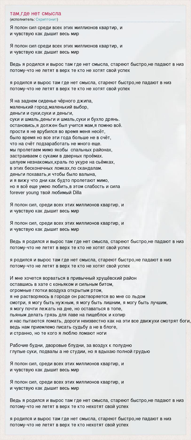 Я полон сил среди всех этих миллионов квартир, и и чувствую как дышит весь мир Я полон сил среди всех этих миллионов квартир, и и чувствую как дышит весь мир Ведь я родился и вырос там где нет смысла, стареют быстро,не падают в низ потому-что не летят в верх те кто не хотят свой успех я родился и вырос там где нет смысла, стареют быстро,не падают в низ потому-что не летят в верх те кто не хотят свой успех Я на заднем сиденье чёрного джипа, маленький город,маленький выбор, деньги и суки,суки и деньги, суки и шмаль,деньги и шмаль,суки и бухло дрянь. остановись,я должен был учится мам,я помню всё. прости я не врубился во время меня несёт, было время но все эти года больше не в счёт, что на счёт подзаработать не много еще. мы пролетаем мимо якобы спальных районах, застраиваем с суками в дверных проёмах. целуем незнакомых,краль по укуре на сьёмках, в этих бесконечных ломках,по скандалам. деньги похавать,и чтобы было валына, и я вижу что дни как будто пролетают мимо, но я всё еще умею любить,в этом слабость и сила forever young твой любимый Dilla Я полон сил, среди всех этих миллионов квартир, и и чувствую как дышит весь мир Я полон сил, среди всех этих миллионов квартир, и и чувствую как дышит весь мир Ведь я родился и вырос там где нет смысла, стареют быстро,не падают в низ потому-что не летят в верх те кто не хотят свой успех я родился и вырос там где нет смысла, стареют быстро,не падают в низ потому-что не летят в верх те кто не хотят свой успех И мне хочется ворваться в привычный хрущёвский район оставшись в хате с коньяком и сильным битом, огромные глотки воздуха открытым ртом, я не растворяюсь в городе он растворяется во мне со льдом смотри, я могу быть нужным, я могу быть лишним, я могу быть лучшим, я могу почти лежать на дне, но оставаться в топе, пьяным делать грязь для лаве на пищеблок и копир и нас пытаются ломать, дороги неизвестно как на эти все движухи смотрят боги, ведь нам приемлемо писать судьбу а не в блоге, и странно, но те кого я люблю ломают ноги Рабочие будни, дворовые блудни, за воздух к полудню глупые суки, подвалы а не студии, но я вдыхаю полной грудью Я полон сил, среди всех этих миллионов квартир, и и чувствую как дышит весь мир Я полон сил, среди всех этих миллионов квартир, и и чувствую как дышит весь мир Ведь я родился и вырос там где нет смысла, стареют быстро,не падают в низ потому-что не летят в верх те кто нехотят свой успех я родился и вырос там где нет смысла, стареют быстро,не падают в низ потому-что не летят в верх те кто нехотят свой успех