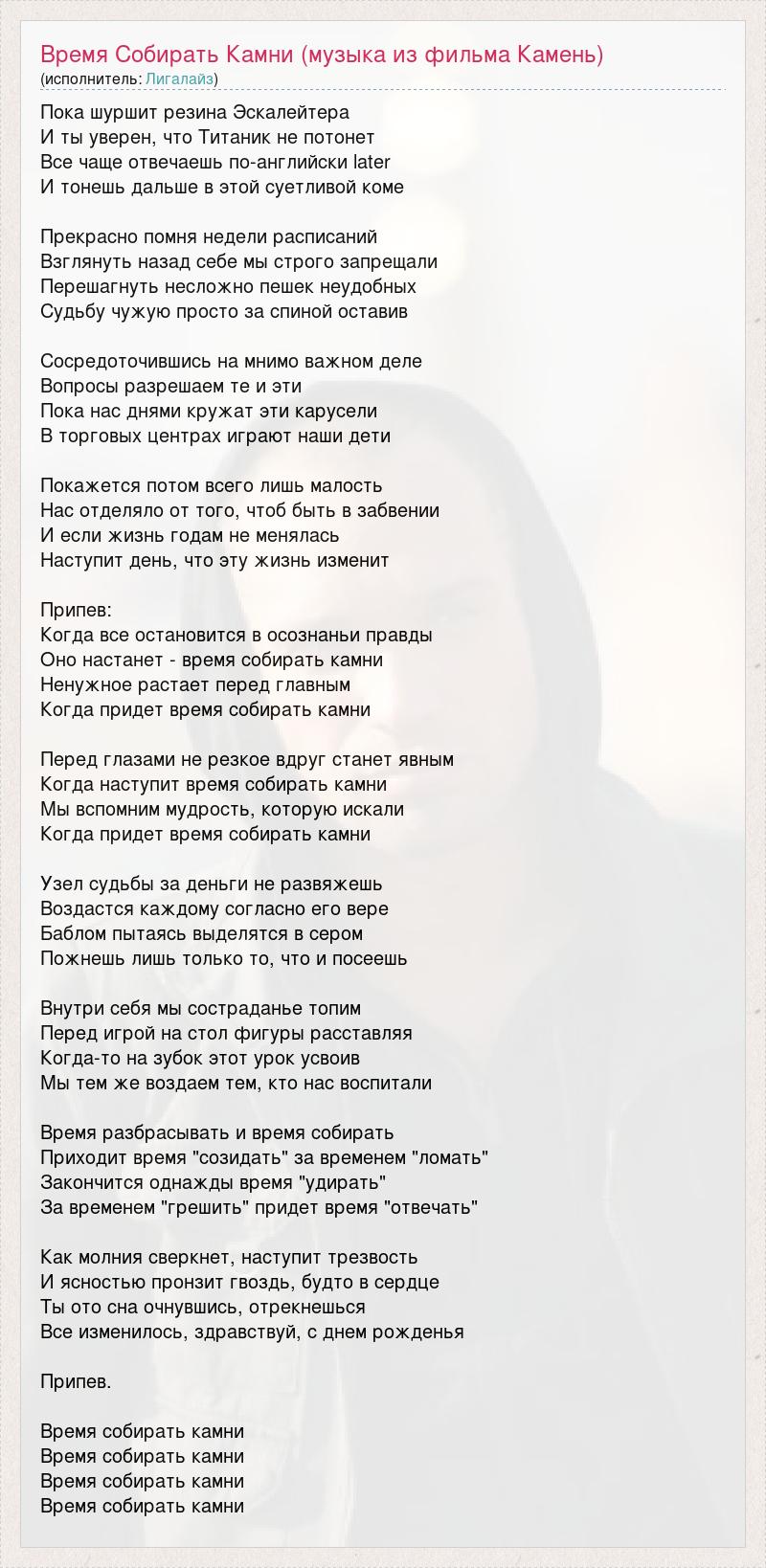 Пока шуршит резина Эскалейтера И ты уверен, что Титаник не потонет Все чаще отвечаешь по-английски later И тонешь дальше в этой суетливой коме Прекрасно помня недели расписаний Взглянуть назад себе мы строго запрещали Перешагнуть несложно пешек неудобных Судьбу чужую просто за спиной оставив Сосредоточившись на мнимо важном деле Вопросы разрешаем те и эти Пока нас днями кружат эти карусели В торговых центрах играют наши дети Покажется потом всего лишь малость Нас отделяло от того, чтоб быть в забвении И если жизнь годам не менялась Наступит день, что эту жизнь изменит Припев: Когда все остановится в осознаньи правды Оно настанет - время собирать камни Ненужное растает перед главным Когда придет время собирать камни Перед глазами не резкое вдруг станет явным Когда наступит время собирать камни Мы вспомним мудрость, которую искали Когда придет время собирать камни Узел судьбы за деньги не развяжешь Воздастся каждому согласно его вере Баблом пытаясь выделятся в сером Пожнешь лишь только то, что и посеешь Внутри себя мы состраданье топим Перед игрой на стол фигуры расставляя Когда-то на зубок этот урок усвоив Мы тем же воздаем тем, кто нас воспитали Время разбрасывать и время собирать Приходит время "созидать" за временем "ломать" Закончится однажды время "удирать" За временем "грешить" придет время "отвечать" Как молния сверкнет, наступит трезвость И ясностью пронзит гвоздь, будто в сердце Ты ото сна очнувшись, отрекнешься Все изменилось, здравствуй, с днем рожденья Припев. Время собирать камни Время собирать камни Время собирать камни Время собирать камни
