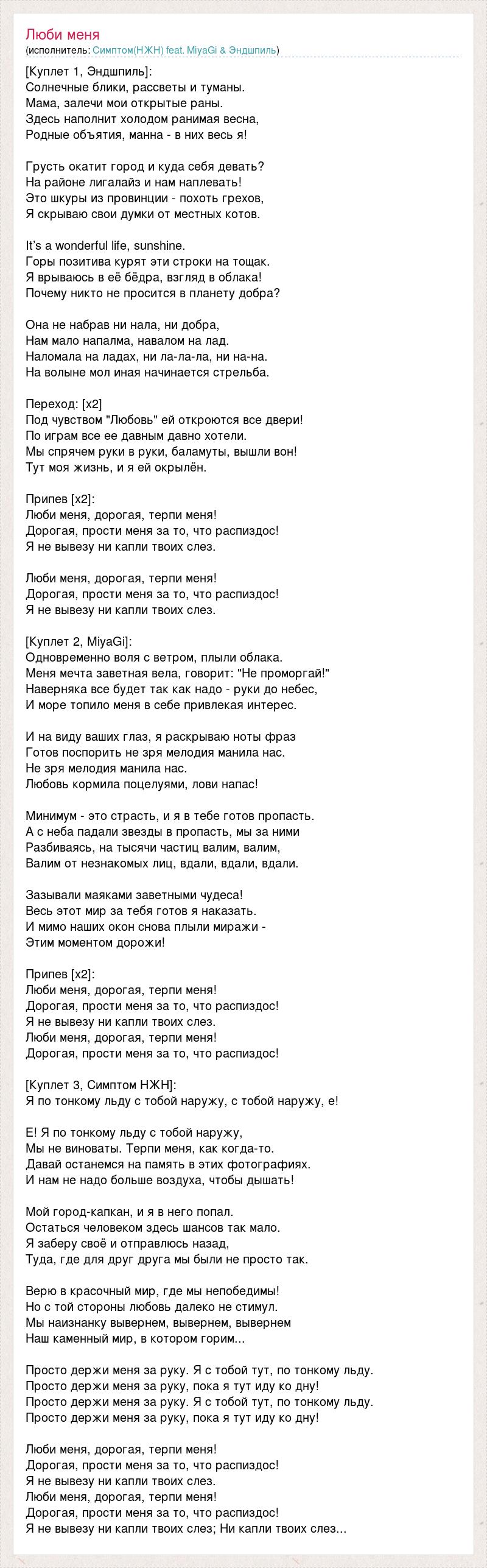 [Куплет 1, Эндшпиль]: Солнечные блики, рассветы и туманы. Мама, залечи мои открытые раны. Здесь наполнит холодом ранимая весна, Родные объятия, манна - в них весь я! Грусть окатит город и куда себя девать? На районе лигалайз и нам наплевать! Это шкуры из провинции - похоть грехов, Я скрываю свои думки от местных котов. It’s a wonderful life, sunshine. Горы позитива курят эти строки на тощак. Я врываюсь в её бёдра, взгляд в облака! Почему никто не просится в планету добра? Она не набрав ни нала, ни добра, Нам мало напалма, навалом на лад. Наломала на ладах, ни ла-ла-ла, ни на-на. На волыне мол иная начинается стрельба. Переход: [х2] Под чувством "Любовь" ей откроются все двери! По играм все ее давным давно хотели. Мы спрячем руки в руки, баламуты, вышли вон! Тут моя жизнь, и я ей окрылён. Припев [х2]: Люби меня, дорогая, терпи меня! Дорогая, прости меня за то, что распиздос! Я не вывезу ни капли твоих слез. Люби меня, дорогая, терпи меня! Дорогая, прости меня за то, что распиздос! Я не вывезу ни капли твоих слез. [Куплет 2, MiyaGi]: Одновременно воля с ветром, плыли облака. Меня мечта заветная вела, говорит: "Не проморгай!" Наверняка все будет так как надо - руки до небес, И море топило меня в себе привлекая интерес. И на виду ваших глаз, я раскрываю ноты фраз Готов поспорить не зря мелодия манила нас. Не зря мелодия манила нас. Любовь кормила поцелуями, лови напас! Минимум - это страсть, и я в тебе готов пропасть. А с неба падали звезды в пропасть, мы за ними Разбиваясь, на тысячи частиц валим, валим, Валим от незнакомых лиц, вдали, вдали, вдали. Зазывали маяками заветными чудеса! Весь этот мир за тебя готов я наказать. И мимо наших окон снова плыли миражи - Этим моментом дорожи! Припев [х2]: Люби меня, дорогая, терпи меня! Дорогая, прости меня за то, что распиздос! Я не вывезу ни капли твоих слез. Люби меня, дорогая, терпи меня! Дорогая, прости меня за то, что распиздос! [Куплет 3, Симптом НЖН]: Я по тонкому льду с тобой наружу, с тобой наружу, е! Е! Я по тонкому льду с тобой наружу, Мы не виноваты. Терпи меня, как когда-то. Давай останемся на память в этих фотографиях. И нам не надо больше воздуха, чтобы дышать! Мой город-капкан, и я в него попал. Остаться человеком здесь шансов так мало. Я заберу своё и отправлюсь назад, Туда, где для друг друга мы были не просто так. Верю в красочный мир, где мы непобедимы! Но с той стороны любовь далеко не стимул. Мы наизнанку вывернем, вывернем, вывернем Наш каменный мир, в котором горим... Просто держи меня за руку. Я с тобой тут, по тонкому льду. Просто держи меня за руку, пока я тут иду ко дну! Просто держи меня за руку. Я с тобой тут, по тонкому льду. Просто держи меня за руку, пока я тут иду ко дну! Люби меня, дорогая, терпи меня! Дорогая, прости меня за то, что распиздос! Я не вывезу ни капли твоих слез. Люби меня, дорогая, терпи меня! Дорогая, прости меня за то, что распиздос! Я не вывезу ни капли твоих слез; Ни капли твоих слез...