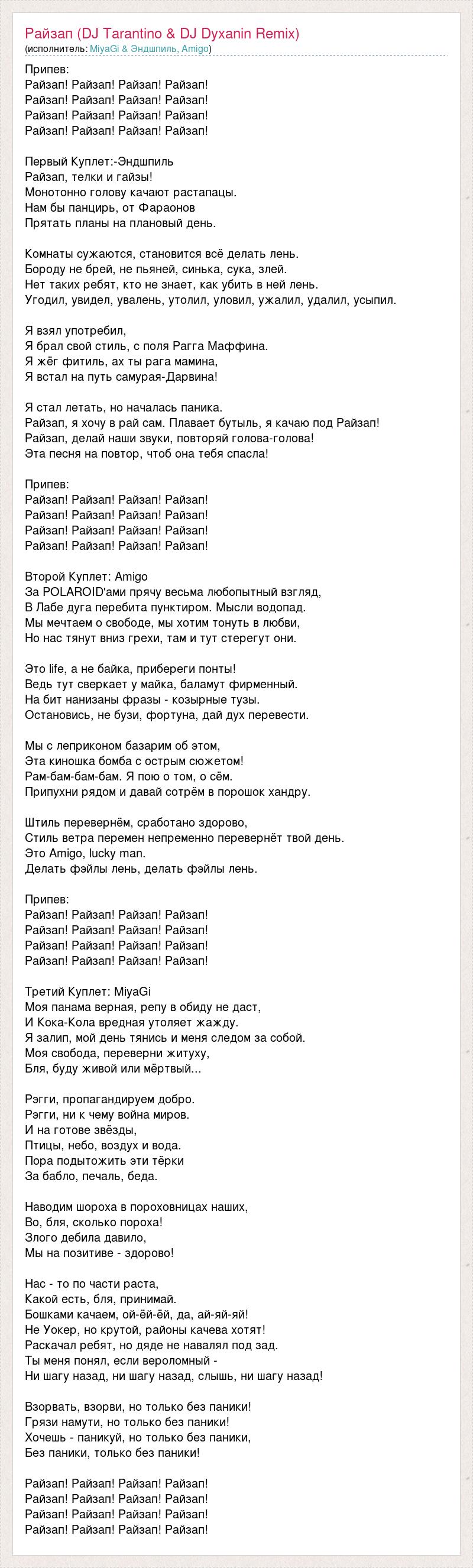 Припев: Райзап! Райзап! Райзап! Райзап! Райзап! Райзап! Райзап! Райзап! Райзап! Райзап! Райзап! Райзап! Райзап! Райзап! Райзап! Райзап! Первый Куплет:-Эндшпиль Райзап, телки и гайзы! Монотонно голову качают растапацы. Нам бы панцирь, от Фараонов Прятать планы на плановый день. Комнаты сужаются, становится всё делать лень. Бороду не брей, не пьяней, синька, сука, злей. Нет таких ребят, кто не знает, как убить в ней лень. Угодил, увидел, увалень, утолил, уловил, ужалил, удалил, усыпил. Я взял употребил, Я брал свой стиль, с поля Рагга Маффина. Я жёг фитиль, ах ты рага мамина, Я встал на путь самурая-Дарвина! Я стал летать, но началась паника. Райзап, я хочу в рай сам. Плавает бутыль, я качаю под Райзап! Райзап, делай наши звуки, повторяй голова-голова! Эта песня на повтор, чтоб она тебя спасла! Припев: Райзап! Райзап! Райзап! Райзап! Райзап! Райзап! Райзап! Райзап! Райзап! Райзап! Райзап! Райзап! Райзап! Райзап! Райзап! Райзап! Второй Куплет: Amigo За POLAROID'ами прячу весьма любопытный взгляд, В Лабе дуга перебита пунктиром. Мысли водопад. Мы мечтаем о свободе, мы хотим тонуть в любви, Но нас тянут вниз грехи, там и тут стерегут они. Это life, а не байка, прибереги понты! Ведь тут сверкает у майка, баламут фирменный. На бит нанизаны фразы - козырные тузы. Остановись, не бузи, фортуна, дай дух перевести. Мы с леприконом базарим об этом, Эта киношка бомба с острым сюжетом! Рам-бам-бам-бам. Я пою о том, о сём. Припухни рядом и давай сотрём в порошок хандру. Штиль перевернём, сработано здорово, Стиль ветра перемен непременно перевернёт твой день. Это Amigo, lucky man. Делать фэйлы лень, делать фэйлы лень. Припев: Райзап! Райзап! Райзап! Райзап! Райзап! Райзап! Райзап! Райзап! Райзап! Райзап! Райзап! Райзап! Райзап! Райзап! Райзап! Райзап! Третий Куплет: MiyaGi Моя панама верная, репу в обиду не даст, И Кока-Кола вредная утоляет жажду. Я залип, мой день тянись и меня следом за собой. Моя свобода, переверни житуху, Бля, буду живой или мёртвый... Рэгги, пропагандируем добро. Рэгги, ни к чему война миров. И на готове звёзды, Птицы, небо, воздух и вода. Пора подытожить эти тёрки За бабло, печаль, беда. Наводим шороха в пороховницах наших, Во, бля, сколько пороха! Злого дебила давило, Мы на позитиве - здорово! Нас - то по части раста, Какой есть, бля, принимай. Бошками качаем, ой-ёй-ёй, да, ай-яй-яй! Не Уокер, но крутой, районы качева хотят! Раскачал ребят, но дяде не навалял под зад. Ты меня понял, если вероломный - Ни шагу назад, ни шагу назад, слышь, ни шагу назад! Взорвать, взорви, но только без паники! Грязи намути, но только без паники! Хочешь - паникуй, но только без паники, Без паники, только без паники! Райзап! Райзап! Райзап! Райзап! Райзап! Райзап! Райзап! Райзап! Райзап! Райзап! Райзап! Райзап! Райзап! Райзап! Райзап! Райзап!