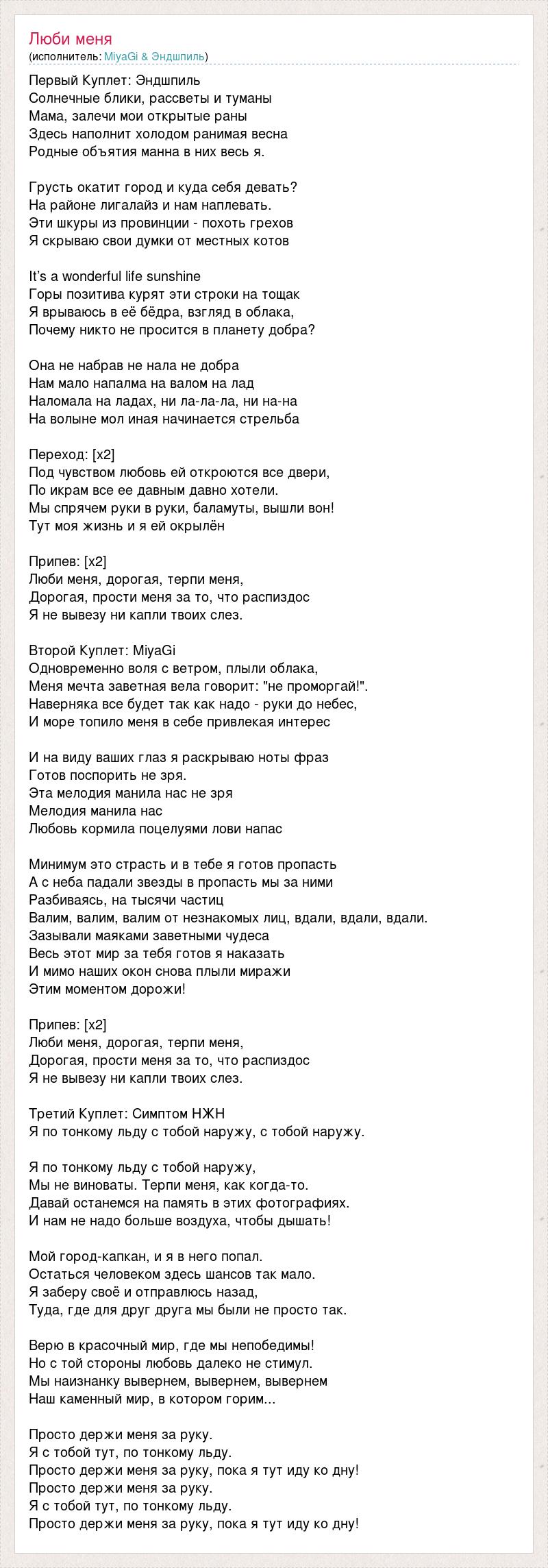 Первый Куплет: Эндшпиль Солнечные блики, рассветы и туманы Мама, залечи мои открытые раны Здесь наполнит холодом ранимая весна Родные объятия манна в них весь я. Грусть окатит город и куда себя девать? На районе лигалайз и нам наплевать. Эти шкуры из провинции - похоть грехов Я скрываю свои думки от местных котов It’s a wonderful life sunshine Горы позитива курят эти строки на тощак Я врываюсь в её бёдра, взгляд в облака, Почему никто не просится в планету добра? Она не набрав не нала не добра Нам мало напалма на валом на лад Наломала на ладах, ни ла-ла-ла, ни на-на На волыне мол иная начинается стрельба Переход: [х2] Под чувством любовь ей откроются все двери, По икрам все ее давным давно хотели. Мы спрячем руки в руки, баламуты, вышли вон! Тут моя жизнь и я ей окрылён Припев: [х2] Люби меня, дорогая, терпи меня, Дорогая, прости меня за то, что распиздос Я не вывезу ни капли твоих слез. Второй Куплет: MiyaGi Одновременно воля с ветром, плыли облака, Меня мечта заветная вела говорит: "не проморгай!". Наверняка все будет так как надо - руки до небес, И море топило меня в себе привлекая интерес И на виду ваших глаз я раскрываю ноты фраз Готов поспорить не зря. Эта мелодия манила нас не зря Мелодия манила нас Любовь кормила поцелуями лови напас Минимум это страсть и в тебе я готов пропасть А с неба падали звезды в пропасть мы за ними Разбиваясь, на тысячи частиц Валим, валим, валим от незнакомых лиц, вдали, вдали, вдали. Зазывали маяками заветными чудеса Весь этот мир за тебя готов я наказать И мимо наших окон снова плыли миражи Этим моментом дорожи! Припев: [х2] Люби меня, дорогая, терпи меня, Дорогая, прости меня за то, что распиздос Я не вывезу ни капли твоих слез. Третий Куплет: Симптом НЖН Я по тонкому льду с тобой наружу, с тобой наружу. Я по тонкому льду с тобой наружу, Мы не виноваты. Терпи меня, как когда-то. Давай останемся на память в этих фотографиях. И нам не надо больше воздуха, чтобы дышать! Мой город-капкан, и я в него попал. Остаться человеком здесь шансов так мало. Я заберу своё и отправлюсь назад, Туда, где для друг друга мы были не просто так. Верю в красочный мир, где мы непобедимы! Но с той стороны любовь далеко не стимул. Мы наизнанку вывернем, вывернем, вывернем Наш каменный мир, в котором горим... Просто держи меня за руку. Я с тобой тут, по тонкому льду. Просто держи меня за руку, пока я тут иду ко дну! Просто держи меня за руку. Я с тобой тут, по тонкому льду. Просто держи меня за руку, пока я тут иду ко дну!