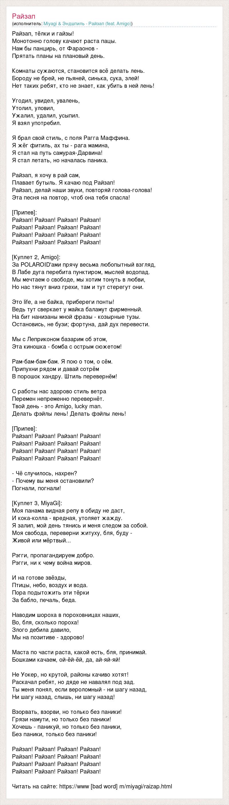 Райзап, тёлки и гайзы! Монотонно голову качают раста пацы. Нам бы панцирь, от Фараонов - Прятать планы на плановый день. Комнаты сужаются, становится всё делать лень. Бороду не брей, не пьяней, синька, сука, злей! Нет таких ребят, кто не знает, как убить в ней лень! Угодил, увидел, увалень, Утолил, уловил, Ужалил, удалил, усыпил. Я взял употребил. Я брал свой стиль, с поля Рагга Маффина. Я жёг фитиль, ах ты - рага мамина, Я стал на путь самурая-Дарвина! Я стал летать, но началась паника. Райзап, я хочу в рай сам, Плавает бутыль. Я качаю под Райзап! Райзап, делай наши звуки, повторяй голова-голова! Эта песня на повтор, чтоб она тебя спасла! [Припев]: Райзап! Райзап! Райзап! Райзап! Райзап! Райзап! Райзап! Райзап! Райзап! Райзап! Райзап! Райзап! Райзап! Райзап! Райзап! Райзап! [Куплет 2, Amigo]: За POLAROID'ами прячу весьма любопытный взгляд, В Лабе дуга перебита пунктиром, мыслей водопад. Мы мечтаем о свободе, мы хотим тонуть в любви, Но нас тянут вниз грехи, там и тут стерегут они. Это life, а не байка, прибереги понты! Ведь тут сверкает у майка баламут фирменный. На бит нанизаны мной фразы - козырные тузы. Остановись, не бузи; фортуна, дай дух перевести. Мы с Леприконом базарим об этом, Эта киношка - бомба с острым сюжетом! Рам-бам-бам-бам. Я пою о том, о сём. Припухни рядом и давай сотрём В порошок хандру. Штиль перевернём! С работы нас здорово стиль ветра Перемен непременно перевернёт. Твой день - это Amigo, lucky man. Делать фэйлы лень! Делать фэйлы лень! [Припев]: Райзап! Райзап! Райзап! Райзап! Райзап! Райзап! Райзап! Райзап! Райзап! Райзап! Райзап! Райзап! Райзап! Райзап! Райзап! Райзап! - Чё случилось, нахрен? - Почему вы меня остановили? Погнали, погнали! [Куплет 3, MiyaGi]: Моя панама видная репу в обиду не даст, И кока-колла - вредная, утоляет жажду. Я залип, мой день тянись и меня следом за собой. Моя свобода, переверни житуху, бля, буду - Живой или мёртвый... Рэгги, пропагандируем добро. Рэгги, ни к чему война миров. И на готове звёзды, Птицы, небо, воздух и вода. Пора подытожить эти тёрки За бабло, печаль, беда. Наводим шороха в пороховницах наших, Во, бля, сколько пороха! Злого дебила давило, Мы на позитиве - здорово! Маста по части раста, какой есть, бля, принимай. Бошками качаем, ой-ёй-ёй, да, ай-яй-яй! Не Уокер, но крутой, районы качиво хотят! Раскачал ребят, но дяде не навалял под зад. Ты меня понял, если вероломный - ни шагу назад, Ни шагу назад, слышь, ни шагу назад! Взорвать, взорви, но только без паники! Грязи намути, но только без паники! Хочешь - паникуй, но только без паники, Без паники, только без паники! Райзап! Райзап! Райзап! Райзап! Райзап! Райзап! Райзап! Райзап! Райзап! Райзап! Райзап! Райзап! Райзап! Райзап! Райзап! Райзап! Читать на сайте: https://www [bad word] m/miyagi/raizap.html