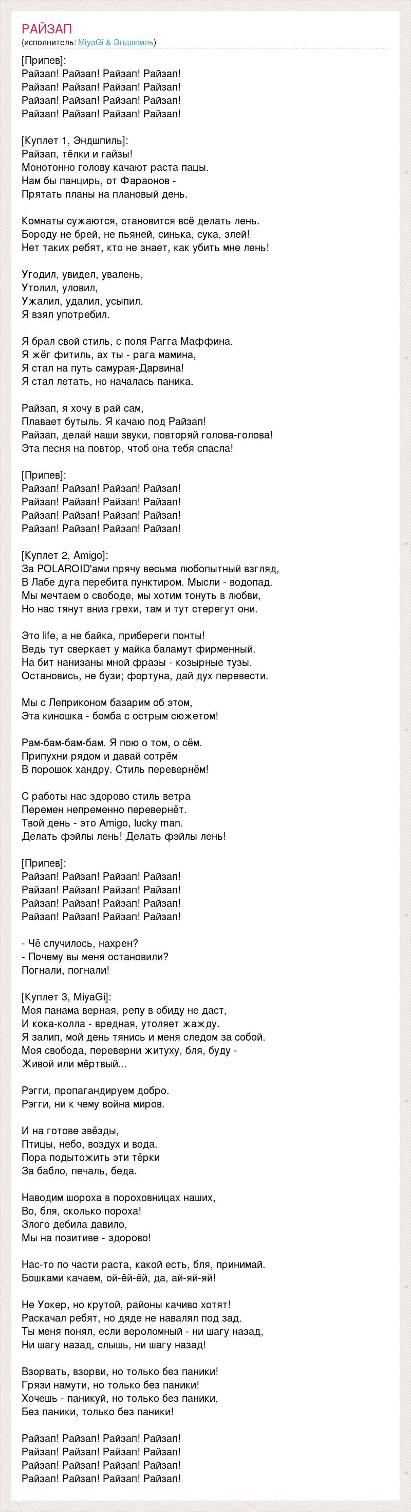 [Припев]: Райзап! Райзап! Райзап! Райзап! Райзап! Райзап! Райзап! Райзап! Райзап! Райзап! Райзап! Райзап! Райзап! Райзап! Райзап! Райзап! [Куплет 1, Эндшпиль]: Райзап, тёлки и гайзы! Монотонно голову качают раста пацы. Нам бы панцирь, от Фараонов - Прятать планы на плановый день. Комнаты сужаются, становится всё делать лень. Бороду не брей, не пьяней, синька, сука, злей! Нет таких ребят, кто не знает, как убить мне лень! Угодил, увидел, увалень, Утолил, уловил, Ужалил, удалил, усыпил. Я взял употребил. Я брал свой стиль, с поля Рагга Маффина. Я жёг фитиль, ах ты - рага мамина, Я стал на путь самурая-Дарвина! Я стал летать, но началась паника. Райзап, я хочу в рай сам, Плавает бутыль. Я качаю под Райзап! Райзап, делай наши звуки, повторяй голова-голова! Эта песня на повтор, чтоб она тебя спасла! [Припев]: Райзап! Райзап! Райзап! Райзап! Райзап! Райзап! Райзап! Райзап! Райзап! Райзап! Райзап! Райзап! Райзап! Райзап! Райзап! Райзап! [Куплет 2, Amigo]: За POLAROID'ами прячу весьма любопытный взгляд, В Лабе дуга перебита пунктиром. Мысли - водопад. Мы мечтаем о свободе, мы хотим тонуть в любви, Но нас тянут вниз грехи, там и тут стерегут они. Это life, а не байка, прибереги понты! Ведь тут сверкает у майка баламут фирменный. На бит нанизаны мной фразы - козырные тузы. Остановись, не бузи; фортуна, дай дух перевести. Мы с Леприконом базарим об этом, Эта киношка - бомба с острым сюжетом! Рам-бам-бам-бам. Я пою о том, о сём. Припухни рядом и давай сотрём В порошок хандру. Стиль перевернём! С работы нас здорово стиль ветра Перемен непременно перевернёт. Твой день - это Amigo, lucky man. Делать фэйлы лень! Делать фэйлы лень! [Припев]: Райзап! Райзап! Райзап! Райзап! Райзап! Райзап! Райзап! Райзап! Райзап! Райзап! Райзап! Райзап! Райзап! Райзап! Райзап! Райзап! - Чё случилось, нахрен? - Почему вы меня остановили? Погнали, погнали! [Куплет 3, MiyaGi]: Моя панама верная, репу в обиду не даст, И кока-колла - вредная, утоляет жажду. Я залип, мой день тянись и меня следом за собой. Моя свобода, переверни житуху, бля, буду - Живой или мёртвый... Рэгги, пропагандируем добро. Рэгги, ни к чему война миров. И на готове звёзды, Птицы, небо, воздух и вода. Пора подытожить эти тёрки За бабло, печаль, беда. Наводим шороха в пороховницах наших, Во, бля, сколько пороха! Злого дебила давило, Мы на позитиве - здорово! Нас-то по части раста, какой есть, бля, принимай. Бошками качаем, ой-ёй-ёй, да, ай-яй-яй! Не Уокер, но крутой, районы качиво хотят! Раскачал ребят, но дяде не навалял под зад. Ты меня понял, если вероломный - ни шагу назад, Ни шагу назад, слышь, ни шагу назад! Взорвать, взорви, но только без паники! Грязи намути, но только без паники! Хочешь - паникуй, но только без паники, Без паники, только без паники! Райзап! Райзап! Райзап! Райзап! Райзап! Райзап! Райзап! Райзап! Райзап! Райзап! Райзап! Райзап! Райзап! Райзап! Райзап! Райзап!