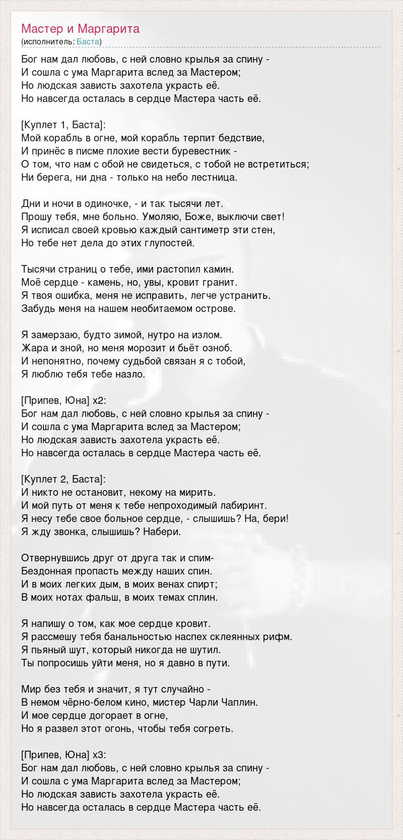 Бог нам дал любовь, с ней словно крылья за спину - И сошла с ума Маргарита вслед за Мастером; Но людская зависть захотела украсть её. Но навсегда осталась в сердце Мастера часть её. [Куплет 1, Баста]: Мой корабль в огне, мой корабль терпит бедствие, И принёс в писме плохие вести буревестник - О том, что нам с обой не свидеться, с тобой не встретиться; Ни берега, ни дна - только на небо лестница. Дни и ночи в одиночке, - и так тысячи лет. Прошу тебя, мне больно. Умоляю, Боже, выключи свет! Я исписал своей кровью каждый сантиметр эти стен, Но тебе нет дела до этих глупостей. Тысячи страниц о тебе, ими растопил камин. Моё сердце - камень, но, увы, кровит гранит. Я твоя ошибка, меня не исправить, легче устранить. Забудь меня на нашем необитаемом острове. Я замерзаю, будто зимой, нутро на излом. Жара и зной, но меня морозит и бьёт озноб. И непонятно, почему судьбой связан я с тобой, Я люблю тебя тебе назло. [Припев, Юна] x2: Бог нам дал любовь, с ней словно крылья за спину - И сошла с ума Маргарита вслед за Мастером; Но людская зависть захотела украсть её. Но навсегда осталась в сердце Мастера часть её. [Куплет 2, Баста]: И никто не остановит, некому на мирить. И мой путь от меня к тебе непроходимый лабиринт. Я несу тебе свое больное сердце, - слышишь? На, бери! Я жду звонка, слышишь? Набери. Отвернувшись друг от друга так и спим- Бездонная пропасть между наших спин. И в моих легких дым, в моих венах спирт; В моих нотах фальш, в моих темах сплин. Я напишу о том, как мое сердце кровит. Я рассмешу тебя банальностью наспех склеянных рифм. Я пьяный шут, который никогда не шутил. Ты попросишь уйти меня, но я давно в пути. Мир без тебя и значит, я тут случайно - В немом чёрно-белом кино, мистер Чарли Чаплин. И мое сердце догорает в огне, Но я развел этот огонь, чтобы тебя согреть. [Припев, Юна] x3: Бог нам дал любовь, с ней словно крылья за спину - И сошла с ума Маргарита вслед за Мастером; Но людская зависть захотела украсть её. Но навсегда осталась в сердце Мастера часть её.