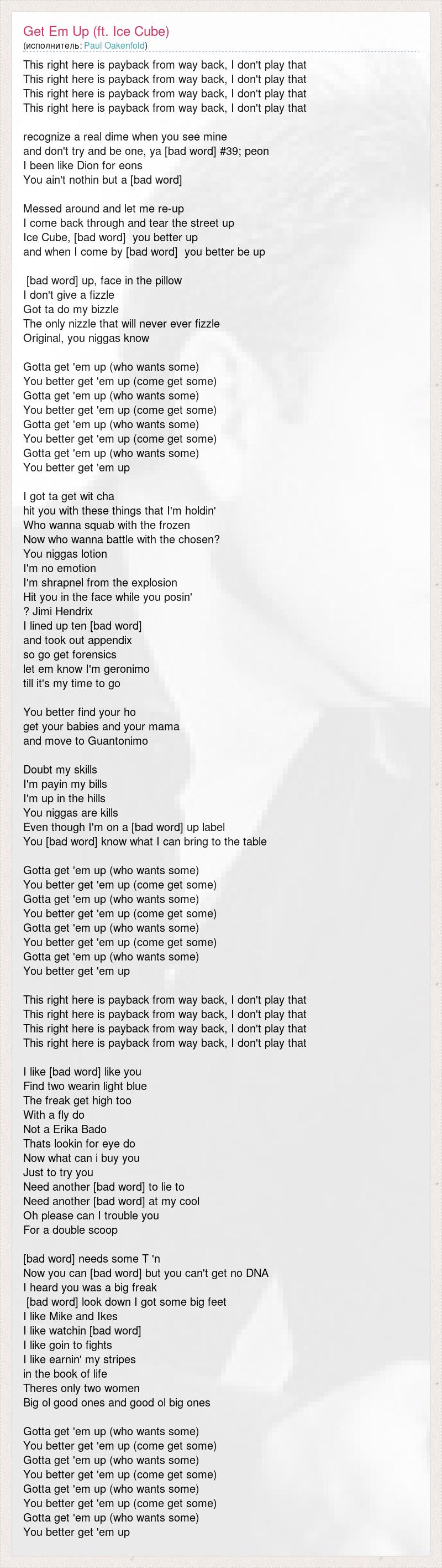 This right here is payback from way back, I don't play that This right here is payback from way back, I don't play that This right here is payback from way back, I don't play that This right here is payback from way back, I don't play that recognize a real dime when you see mine and don't try and be one, ya [bad word] #39; peon I been like Dion for eons You ain't nothin but a [bad word] Messed around and let me re-up I come back through and tear the street up Ice Cube, [bad word] you better up and when I come by [bad word] you better be up [bad word] up, face in the pillow I don't give a fizzle Got ta do my bizzle The only nizzle that will never ever fizzle Original, you niggas know Gotta get 'em up (who wants some) You better get 'em up (come get some) Gotta get 'em up (who wants some) You better get 'em up (come get some) Gotta get 'em up (who wants some) You better get 'em up (come get some) Gotta get 'em up (who wants some) You better get 'em up I got ta get wit cha hit you with these things that I'm holdin' Who wanna squab with the frozen Now who wanna battle with the chosen? You niggas lotion I'm no emotion I'm shrapnel from the explosion Hit you in the face while you posin' ? Jimi Hendrix I lined up ten [bad word] and took out appendix so go get forensics let em know I'm geronimo till it's my time to go You better find your ho get your babies and your mama and move to Guantonimo Doubt my skills I'm payin my bills I'm up in the hills You niggas are kills Even though I'm on a [bad word] up label You [bad word] know what I can bring to the table Gotta get 'em up (who wants some) You better get 'em up (come get some) Gotta get 'em up (who wants some) You better get 'em up (come get some) Gotta get 'em up (who wants some) You better get 'em up (come get some) Gotta get 'em up (who wants some) You better get 'em up This right here is payback from way back, I don't play that This right here is payback from way back, I don't play that This right here is payback from way back, I don't play that This right here is payback from way back, I don't play that I like [bad word] like you Find two wearin light blue The freak get high too With a fly do Not a Erika Bado Thats lookin for eye do Now what can i buy you Just to try you Need another [bad word] to lie to Need another [bad word] at my cool Oh please can I trouble you For a double scoop [bad word] needs some T 'n Now you can [bad word] but you can't get no DNA I heard you was a big freak [bad word] look down I got some big feet I like Mike and Ikes I like watchin [bad word] I like goin to fights I like earnin' my stripes in the book of life Theres only two women Big ol good ones and good ol big ones Gotta get 'em up (who wants some) You better get 'em up (come get some) Gotta get 'em up (who wants some) You better get 'em up (come get some) Gotta get 'em up (who wants some) You better get 'em up (come get some) Gotta get 'em up (who wants some) You better get 'em up