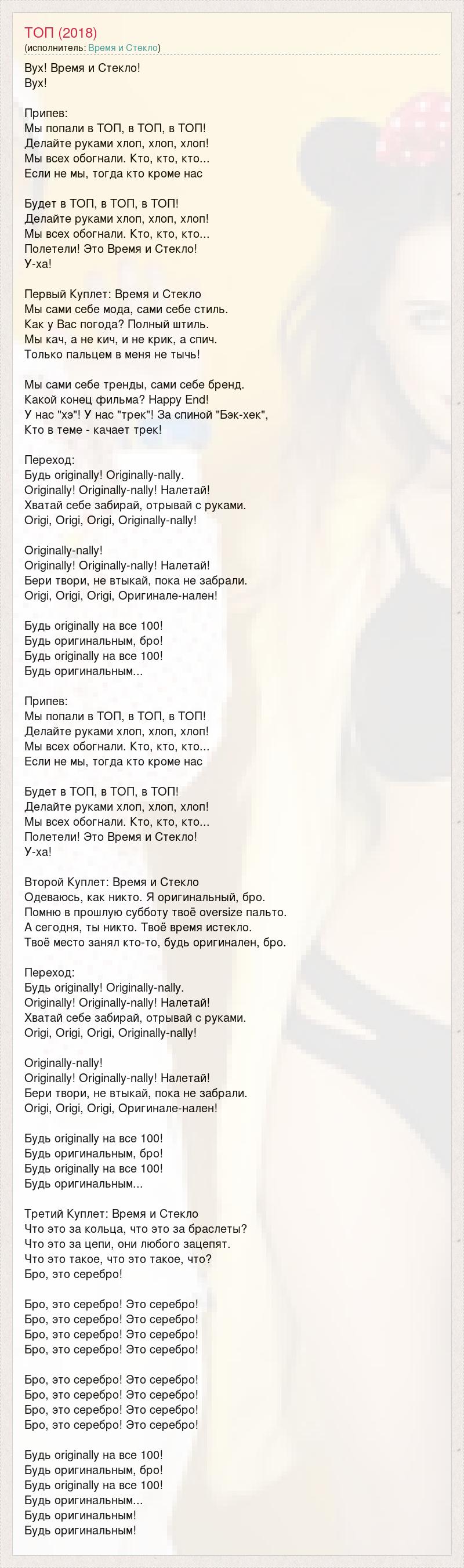 Вух! Время и Стекло! Вух! Припев: Мы попали в ТОП, в ТОП, в ТОП! Делайте руками хлоп, хлоп, хлоп! Мы всех обогнали. Кто, кто, кто... Если не мы, тогда кто кроме нас Будет в ТОП, в ТОП, в ТОП! Делайте руками хлоп, хлоп, хлоп! Мы всех обогнали. Кто, кто, кто... Полетели! Это Время и Стекло! У-ха! Первый Куплет: Время и Стекло Мы сами себе мода, сами себе стиль. Как у Вас погода? Полный штиль. Мы кач, а не кич, и не крик, а спич. Только пальцем в меня не тычь! Мы сами себе тренды, сами себе бренд. Какой конец фильма? Happy End! У нас "хэ"! У нас "трек"! За спиной "Бэк-хек", Кто в теме - качает трек! Переход: Будь originally! Originally-nally. Originally! Originally-nally! Налетай! Хватай себе забирай, отрывай с руками. Origi, Origi, Origi, Originally-nally! Originally-nally! Originally! Originally-nally! Налетай! Бери твори, не втыкай, пока не забрали. Origi, Origi, Origi, Оригинале-нален! Будь originally на все 100! Будь оригинальным, бро! Будь originally на все 100! Будь оригинальным... Припев: Мы попали в ТОП, в ТОП, в ТОП! Делайте руками хлоп, хлоп, хлоп! Мы всех обогнали. Кто, кто, кто... Если не мы, тогда кто кроме нас Будет в ТОП, в ТОП, в ТОП! Делайте руками хлоп, хлоп, хлоп! Мы всех обогнали. Кто, кто, кто... Полетели! Это Время и Стекло! У-ха! Второй Куплет: Время и Стекло Одеваюсь, как никто. Я оригинальный, бро. Помню в прошлую субботу твоё oversize пальто. А сегодня, ты никто. Твоё время истекло. Твоё место занял кто-то, будь оригинален, бро. Переход: Будь originally! Originally-nally. Originally! Originally-nally! Налетай! Хватай себе забирай, отрывай с руками. Origi, Origi, Origi, Originally-nally! Originally-nally! Originally! Originally-nally! Налетай! Бери твори, не втыкай, пока не забрали. Origi, Origi, Origi, Оригинале-нален! Будь originally на все 100! Будь оригинальным, бро! Будь originally на все 100! Будь оригинальным... Третий Куплет: Время и Стекло Что это за кольца, что это за браслеты? Что это за цепи, они любого зацепят. Что это такое, что это такое, что? Бро, это серебро! Бро, это серебро! Это серебро! Бро, это серебро! Это серебро! Бро, это серебро! Это серебро! Бро, это серебро! Это серебро! Бро, это серебро! Это серебро! Бро, это серебро! Это серебро! Бро, это серебро! Это серебро! Бро, это серебро! Это серебро! Будь originally на все 100! Будь оригинальным, бро! Будь originally на все 100! Будь оригинальным... Будь оригинальным! Будь оригинальным!