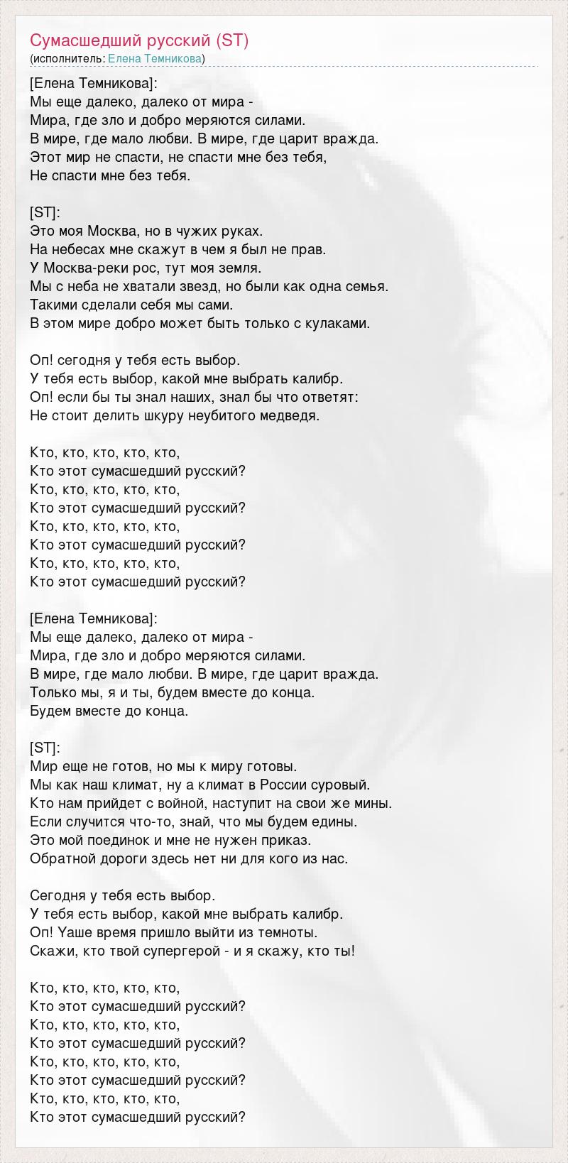 [Елена Темникова]: Мы еще далеко, далеко от мира - Мира, где зло и добро меряются силами. В мире, где мало любви. В мире, где царит вражда. Этот мир не спасти, не спасти мне без тебя, Не спасти мне без тебя. [ST]: Это моя Москва, но в чужих руках. На небесах мне скажут в чем я был не прав. У Москва-реки рос, тут моя земля. Мы с неба не хватали звезд, но были как одна семья. Такими сделали себя мы сами. В этом мире добро может быть только с кулаками. Оп! сегодня у тебя есть выбор. У тебя есть выбор, какой мне выбрать калибр. Оп! если бы ты знал наших, знал бы что ответят: Не стоит делить шкуру неубитого медведя. Кто, кто, кто, кто, кто, Кто этот сумасшедший русский? Кто, кто, кто, кто, кто, Кто этот сумасшедший русский? Кто, кто, кто, кто, кто, Кто этот сумасшедший русский? Кто, кто, кто, кто, кто, Кто этот сумасшедший русский? [Елена Темникова]: Мы еще далеко, далеко от мира - Мира, где зло и добро меряются силами. В мире, где мало любви. В мире, где царит вражда. Только мы, я и ты, будем вместе до конца. Будем вместе до конца. [ST]: Мир еще не готов, но мы к миру готовы. Мы как наш климат, ну а климат в России суровый. Кто нам прийдет с войной, наступит на свои же мины. Если случится что-то, знай, что мы будем едины. Это мой поединок и мне не нужен приказ. Обратной дороги здесь нет ни для кого из нас. Сегодня у тебя есть выбор. У тебя есть выбор, какой мне выбрать калибр. Оп! Yаше время пришло выйти из темноты. Скажи, кто твой супергерой - и я скажу, кто ты! Кто, кто, кто, кто, кто, Кто этот сумасшедший русский? Кто, кто, кто, кто, кто, Кто этот сумасшедший русский? Кто, кто, кто, кто, кто, Кто этот сумасшедший русский? Кто, кто, кто, кто, кто, Кто этот сумасшедший русский?