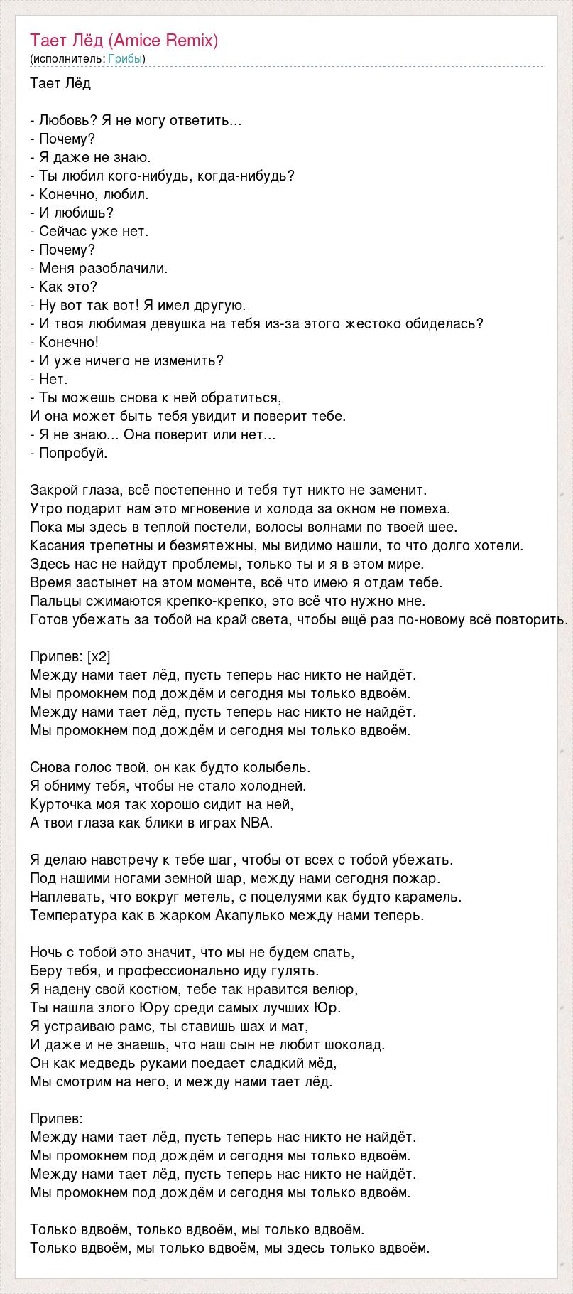 Тает Лёд - Любовь? Я не могу ответить... - Почему? - Я даже не знаю. - Ты любил кого-нибудь, когда-нибудь? - Конечно, любил. - И любишь? - Сейчас уже нет. - Почему? - Меня разоблачили. - Как это? - Ну вот так вот! Я имел другую. - И твоя любимая девушка на тебя из-за этого жестоко обиделась? - Конечно! - И уже ничего не изменить? - Нет. - Ты можешь снова к ней обратиться, И она может быть тебя увидит и поверит тебе. - Я не знаю... Она поверит или нет... - Попробуй. Закрой глаза, всё постепенно и тебя тут никто не заменит. Утро подарит нам это мгновение и холода за окном не помеха. Пока мы здесь в теплой постели, волосы волнами по твоей шее. Касания трепетны и безмятежны, мы видимо нашли, то что долго хотели. Здесь нас не найдут проблемы, только ты и я в этом мире. Время застынет на этом моменте, всё что имею я отдам тебе. Пальцы сжимаются крепко-крепко, это всё что нужно мне. Готов убежать за тобой на край света, чтобы ещё раз по-новому всё повторить. Припев: [x2] Между нами тает лёд, пусть теперь нас никто не найдёт. Мы промокнем под дождём и сегодня мы только вдвоём. Между нами тает лёд, пусть теперь нас никто не найдёт. Мы промокнем под дождём и сегодня мы только вдвоём. Снова голос твой, он как будто колыбель. Я обниму тебя, чтобы не стало холодней. Курточка моя так хорошо сидит на ней, А твои глаза как блики в играх NBA. Я делаю навстречу к тебе шаг, чтобы от всех с тобой убежать. Под нашими ногами земной шар, между нами сегодня пожар. Наплевать, что вокруг метель, с поцелуями как будто карамель. Температура как в жарком Акапулько между нами теперь. Ночь с тобой это значит, что мы не будем спать, Беру тебя, и профессионально иду гулять. Я надену свой костюм, тебе так нравится велюр, Ты нашла злого Юру среди самых лучших Юр. Я устраиваю рамс, ты ставишь шах и мат, И даже и не знаешь, что наш сын не любит шоколад. Он как медведь руками поедает сладкий мёд, Мы смотрим на него, и между нами тает лёд. Припев: Между нами тает лёд, пусть теперь нас никто не найдёт. Мы промокнем под дождём и сегодня мы только вдвоём. Между нами тает лёд, пусть теперь нас никто не найдёт. Мы промокнем под дождём и сегодня мы только вдвоём. Только вдвоём, только вдвоём, мы только вдвоём. Только вдвоём, мы только вдвоём, мы здесь только вдвоём.