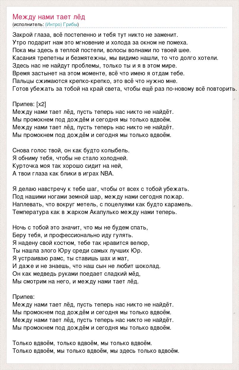 Закрой глаза, всё постепенно и тебя тут никто не заменит. Утро подарит нам это мгновение и холода за окном не помеха. Пока мы здесь в теплой постели, волосы волнами по твоей шее. Касания трепетны и безмятежны, мы видимо нашли, то что долго хотели. Здесь нас не найдут проблемы, только ты и я в этом мире. Время застынет на этом моменте, всё что имею я отдам тебе. Пальцы сжимаются крепко-крепко, это всё что нужно мне. Готов убежать за тобой на край света, чтобы ещё раз по-новому всё повторить. Припев: [x2] Между нами тает лёд, пусть теперь нас никто не найдёт. Мы промокнем под дождём и сегодня мы только вдвоём. Между нами тает лёд, пусть теперь нас никто не найдёт. Мы промокнем под дождём и сегодня мы только вдвоём. Снова голос твой, он как будто колыбель. Я обниму тебя, чтобы не стало холодней. Курточка моя так хорошо сидит на ней, А твои глаза как блики в играх NBA. Я делаю навстречу к тебе шаг, чтобы от всех с тобой убежать. Под нашими ногами земной шар, между нами сегодня пожар. Наплевать, что вокруг метель, с поцелуями как будто карамель. Температура как в жарком Акапулько между нами теперь. Ночь с тобой это значит, что мы не будем спать, Беру тебя, и профессионально иду гулять. Я надену свой костюм, тебе так нравится велюр, Ты нашла злого Юру среди самых лучших Юр. Я устраиваю рамс, ты ставишь шах и мат, И даже и не знаешь, что наш сын не любит шоколад. Он как медведь руками поедает сладкий мёд, Мы смотрим на него, и между нами тает лёд. Припев: Между нами тает лёд, пусть теперь нас никто не найдёт. Мы промокнем под дождём и сегодня мы только вдвоём. Между нами тает лёд, пусть теперь нас никто не найдёт. Мы промокнем под дождём и сегодня мы только вдвоём. Только вдвоём, только вдвоём, мы только вдвоём. Только вдвоём, мы только вдвоём, мы здесь только вдвоём.