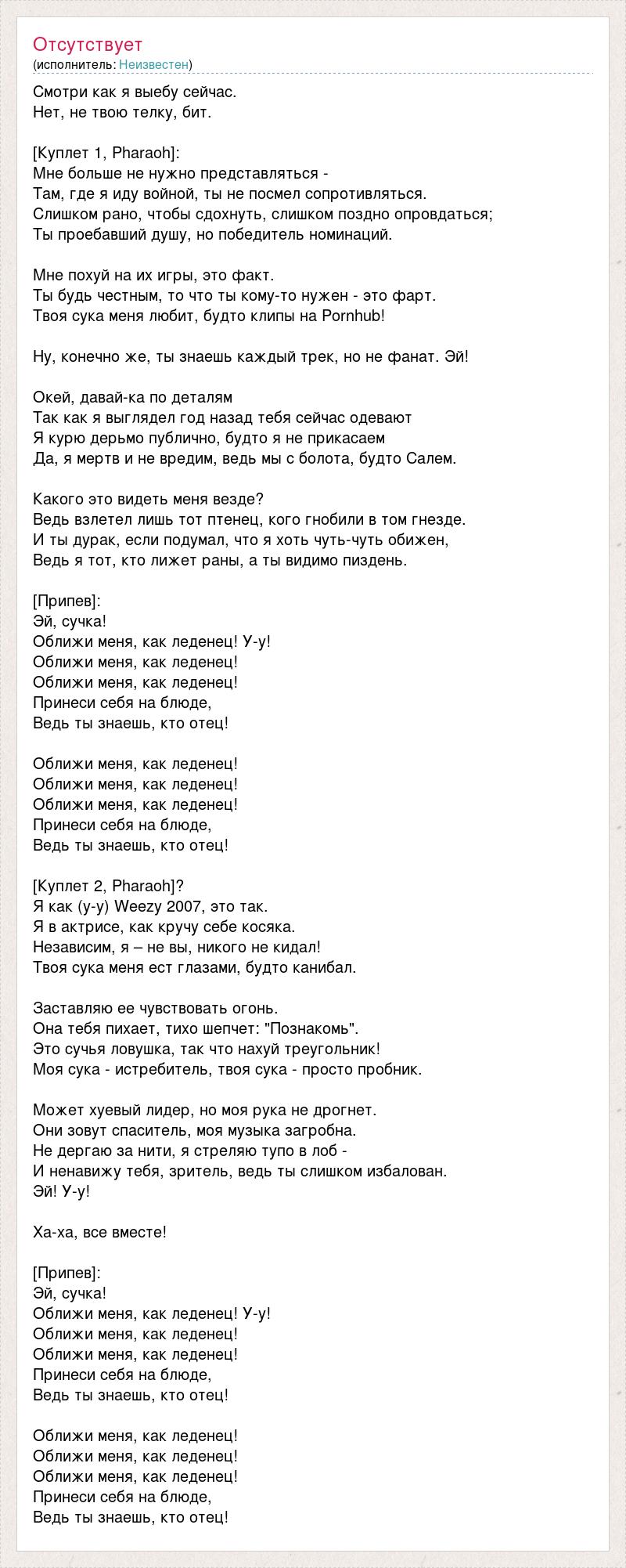 Смотри как я выебу сейчас. Нет, не твою телку, бит. [Куплет 1, Pharaoh]: Мне больше не нужно представляться - Там, где я иду войной, ты не посмел сопротивляться. Слишком рано, чтобы сдохнуть, слишком поздно опровдаться; Ты проебавший душу, но победитель номинаций. Мне похуй на их игры, это факт. Ты будь честным, то что ты кому-то нужен - это фарт. Твоя сука меня любит, будто клипы на Pornhub! Ну, конечно же, ты знаешь каждый трек, но не фанат. Эй! Окей, давай-ка по деталям Так как я выглядел год назад тебя сейчас одевают Я курю дерьмо публично, будто я не прикасаем Да, я мертв и не вредим, ведь мы с болота, будто Салем. Какого это видеть меня везде? Ведь взлетел лишь тот птенец, кого гнобили в том гнезде. И ты дурак, если подумал, что я хоть чуть-чуть обижен, Ведь я тот, кто лижет раны, а ты видимо пиздень. [Припев]: Эй, сучка! Оближи меня, как леденец! У-у! Оближи меня, как леденец! Оближи меня, как леденец! Принеси себя на блюде, Ведь ты знаешь, кто отец! Оближи меня, как леденец! Оближи меня, как леденец! Оближи меня, как леденец! Принеси себя на блюде, Ведь ты знаешь, кто отец! [Куплет 2, Pharaoh]? Я как (у-у) Weezy 2007, это так. Я в актрисе, как кручу себе косяка. Независим, я – не вы, никого не кидал! Твоя сука меня ест глазами, будто канибал. Заставляю ее чувствовать огонь. Она тебя пихает, тихо шепчет: "Познакомь". Это сучья ловушка, так что нахуй треугольник! Моя сука - истребитель, твоя сука - просто пробник. Может хуевый лидер, но моя рука не дрогнет. Они зовут спаситель, моя музыка загробна. Не дергаю за нити, я стреляю тупо в лоб - И ненавижу тебя, зритель, ведь ты слишком избалован. Эй! У-у! Ха-ха, все вместе! [Припев]: Эй, сучка! Оближи меня, как леденец! У-у! Оближи меня, как леденец! Оближи меня, как леденец! Принеси себя на блюде, Ведь ты знаешь, кто отец! Оближи меня, как леденец! Оближи меня, как леденец! Оближи меня, как леденец! Принеси себя на блюде, Ведь ты знаешь, кто отец!