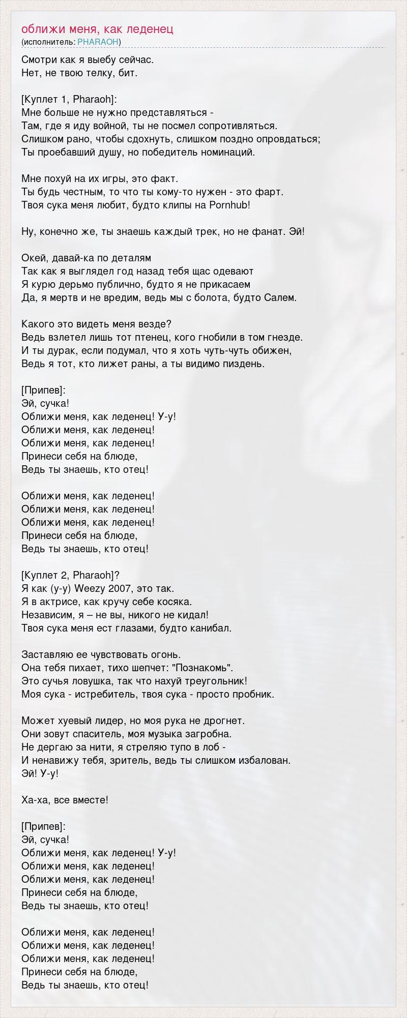 Смотри как я выебу сейчас. Нет, не твою телку, бит. [Куплет 1, Pharaoh]: Мне больше не нужно представляться - Там, где я иду войной, ты не посмел сопротивляться. Слишком рано, чтобы сдохнуть, слишком поздно опровдаться; Ты проебавший душу, но победитель номинаций. Мне похуй на их игры, это факт. Ты будь честным, то что ты кому-то нужен - это фарт. Твоя сука меня любит, будто клипы на Pornhub! Ну, конечно же, ты знаешь каждый трек, но не фанат. Эй! Окей, давай-ка по деталям Так как я выглядел год назад тебя щас одевают Я курю дерьмо публично, будто я не прикасаем Да, я мертв и не вредим, ведь мы с болота, будто Салем. Какого это видеть меня везде? Ведь взлетел лишь тот птенец, кого гнобили в том гнезде. И ты дурак, если подумал, что я хоть чуть-чуть обижен, Ведь я тот, кто лижет раны, а ты видимо пиздень. [Припев]: Эй, сучка! Оближи меня, как леденец! У-у! Оближи меня, как леденец! Оближи меня, как леденец! Принеси себя на блюде, Ведь ты знаешь, кто отец! Оближи меня, как леденец! Оближи меня, как леденец! Оближи меня, как леденец! Принеси себя на блюде, Ведь ты знаешь, кто отец! [Куплет 2, Pharaoh]? Я как (у-у) Weezy 2007, это так. Я в актрисе, как кручу себе косяка. Независим, я – не вы, никого не кидал! Твоя сука меня ест глазами, будто канибал. Заставляю ее чувствовать огонь. Она тебя пихает, тихо шепчет: "Познакомь". Это сучья ловушка, так что нахуй треугольник! Моя сука - истребитель, твоя сука - просто пробник. Может хуевый лидер, но моя рука не дрогнет. Они зовут спаситель, моя музыка загробна. Не дергаю за нити, я стреляю тупо в лоб - И ненавижу тебя, зритель, ведь ты слишком избалован. Эй! У-у! Ха-ха, все вместе! [Припев]: Эй, сучка! Оближи меня, как леденец! У-у! Оближи меня, как леденец! Оближи меня, как леденец! Принеси себя на блюде, Ведь ты знаешь, кто отец! Оближи меня, как леденец! Оближи меня, как леденец! Оближи меня, как леденец! Принеси себя на блюде, Ведь ты знаешь, кто отец!