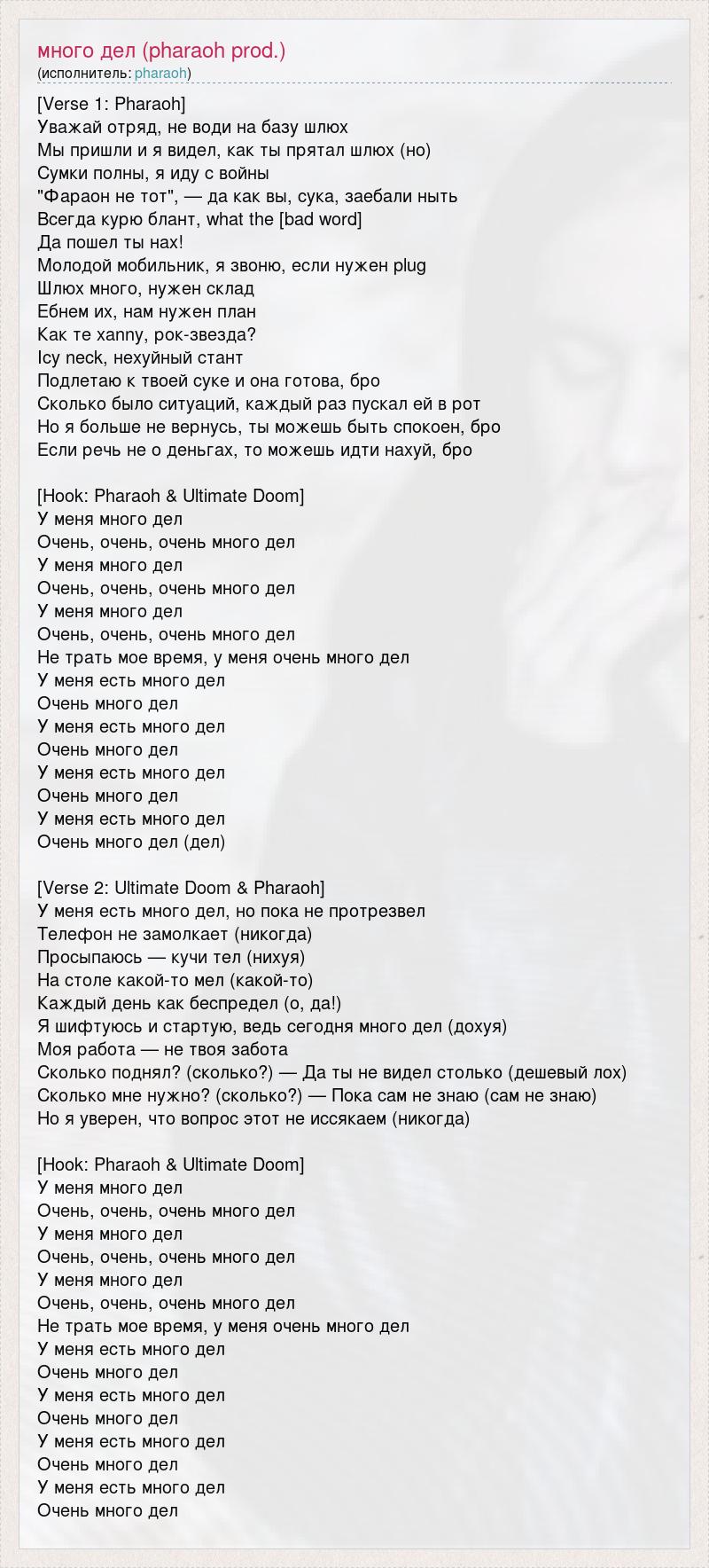 [Verse 1: Pharaoh] Уважай отряд, не води на базу шлюх Мы пришли и я видел, как ты прятал шлюх (но) Сумки полны, я иду с войны "Фараон не тот", — да как вы, сука, заебали ныть Всегда курю блант, what the [bad word] Да пошел ты нах! Молодой мобильник, я звоню, если нужен plug Шлюх много, нужен склад Ебнем их, нам нужен план Как те xanny, рок-звезда? Icy neck, нехуйный стант Подлетаю к твоей суке и она готова, бро Сколько было ситуаций, каждый раз пускал ей в рот Но я больше не вернусь, ты можешь быть спокоен, бро Если речь не о деньгах, то можешь идти нахуй, бро [Hook: Pharaoh & Ultimate Doom] У меня много дел Очень, очень, очень много дел У меня много дел Очень, очень, очень много дел У меня много дел Очень, очень, очень много дел Не трать мое время, у меня очень много дел У меня есть много дел Очень много дел У меня есть много дел Очень много дел У меня есть много дел Очень много дел У меня есть много дел Очень много дел (дел) [Verse 2: Ultimate Doom & Pharaoh] У меня есть много дел, но пока не протрезвел Телефон не замолкает (никогда) Просыпаюсь — кучи тел (нихуя) На столе какой-то мел (какой-то) Каждый день как беспредел (о, да!) Я шифтуюсь и стартую, ведь сегодня много дел (дохуя) Моя работа — не твоя забота Сколько поднял? (сколько?) — Да ты не видел столько (дешевый лох) Сколько мне нужно? (сколько?) — Пока сам не знаю (сам не знаю) Но я уверен, что вопрос этот не иссякаем (никогда) [Hook: Pharaoh & Ultimate Doom] У меня много дел Очень, очень, очень много дел У меня много дел Очень, очень, очень много дел У меня много дел Очень, очень, очень много дел Не трать мое время, у меня очень много дел У меня есть много дел Очень много дел У меня есть много дел Очень много дел У меня есть много дел Очень много дел У меня есть много дел Очень много дел