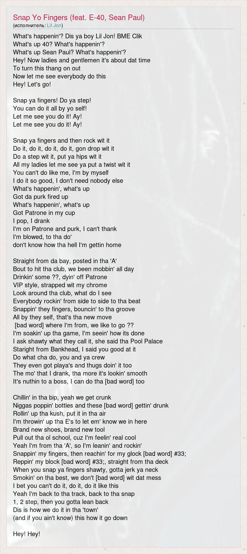 What's happenin'? Dis ya boy Lil Jon! BME Clik What's up 40? What's happenin'? What's up Sean Paul? What's happenin'? Hey! Now ladies and gentlemen it's about dat time To turn this thang on out Now let me see everybody do this Hey! Let's go! Snap ya fingers! Do ya step! You can do it all by yo self! Let me see you do it! Ay! Let me see you do it! Ay! Snap ya fingers and then rock wit it Do it, do it, do it, do it, gon drop wit it Do a step wit it, put ya hips wit it All my ladies let me see ya put a twist wit it You can't do like me, I'm by myself I do it so good, I don't need nobody else What's happenin', what's up Got da purk fired up What's happenin', what's up Got Patrone in my cup I pop, I drank I'm on Patrone and purk, I can't thank I'm blowed, to tha do' don't know how tha hell I'm gettin home Straight from da bay, posted in tha 'A' Bout to hit tha club, we been mobbin' all day Drinkin' some ??, dyin' off Patrone VIP style, strapped wit my chrome Look around tha club, what do I see Everybody rockin' from side to side to tha beat Snappin' they fingers, bouncin' to tha groove All by they self, that's tha new move [bad word] where I'm from, we like to go ?? I'm soakin' up tha game, I'm seein' how its done I ask shawty what they call it, she said tha Pool Palace Staright from Bankhead, I said you good at it Do what cha do, you and ya crew They even got playa's and thugs doin' it too The mo' that I drank, tha more it's lookin' smooth It's nuthin to a boss, I can do tha [bad word] too Chillin' in tha bip, yeah we get crunk Niggas poppin' bottles and these [bad word] gettin' drunk Rollin' up tha kush, put it in tha air I'm throwin' up tha E's to let em' know we in here Brand new shoes, brand new tool Pull out tha ol school, cuz I'm feelin' real cool Yeah I'm from tha 'A', so I'm leanin' and rockin' Snappin' my fingers, then reachin' for my glock [bad word] #33; Reppin' my block [bad word] #33;, straight from tha deck When you snap ya fingers shawty, gotta jerk ya neck Smokin' on tha best, we don't [bad word] wit dat mess I bet you can't do it, do it, do it like this Yeah I'm back to tha track, back to tha snap 1, 2 step, then you gotta lean back Dis is how we do it in tha 'town' (and if you ain't know) this how it go down Hey! Hey!