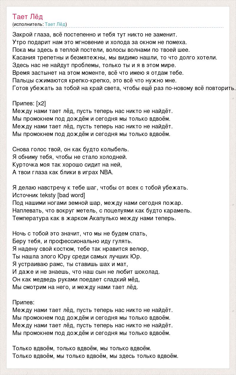 Закрой глаза, всё постепенно и тебя тут никто не заменит. Утро подарит нам это мгновение и холода за окном не помеха. Пока мы здесь в теплой постели, волосы волнами по твоей шее. Касания трепетны и безмятежны, мы видимо нашли, то что долго хотели. Здесь нас не найдут проблемы, только ты и я в этом мире. Время застынет на этом моменте, всё что имею я отдам тебе. Пальцы сжимаются крепко-крепко, это всё что нужно мне. Готов убежать за тобой на край света, чтобы ещё раз по-новому всё повторить. Припев: [x2] Между нами тает лёд, пусть теперь нас никто не найдёт. Мы промокнем под дождём и сегодня мы только вдвоём. Между нами тает лёд, пусть теперь нас никто не найдёт. Мы промокнем под дождём и сегодня мы только вдвоём. Снова голос твой, он как будто колыбель. Я обниму тебя, чтобы не стало холодней. Курточка моя так хорошо сидит на ней, А твои глаза как блики в играх NBA. Я делаю навстречу к тебе шаг, чтобы от всех с тобой убежать. Источник teksty [bad word] Под нашими ногами земной шар, между нами сегодня пожар. Наплевать, что вокруг метель, с поцелуями как будто карамель. Температура как в жарком Акапулько между нами теперь. Ночь с тобой это значит, что мы не будем спать, Беру тебя, и профессионально иду гулять. Я надену свой костюм, тебе так нравится велюр, Ты нашла злого Юру среди самых лучших Юр. Я устраиваю рамс, ты ставишь шах и мат, И даже и не знаешь, что наш сын не любит шоколад. Он как медведь руками поедает сладкий мёд, Мы смотрим на него, и между нами тает лёд. Припев: Между нами тает лёд, пусть теперь нас никто не найдёт. Мы промокнем под дождём и сегодня мы только вдвоём. Между нами тает лёд, пусть теперь нас никто не найдёт. Мы промокнем под дождём и сегодня мы только вдвоём. Только вдвоём, только вдвоём, мы только вдвоём. Только вдвоём, мы только вдвоём, мы здесь только вдвоём.