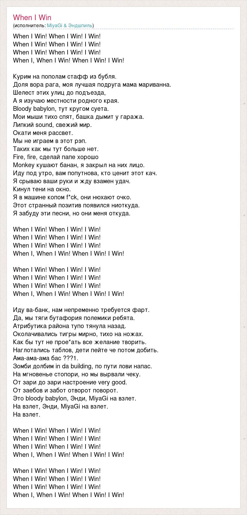 When I Win! When I Win! I Win! When I Win! When I Win! I Win! When I Win! When I Win! I Win! When I, When I Win! When I Win! I Win! Курим на пополам стафф из бубля. Доля вора рага, моя лучшая подруга мама мариванна. Шелест этих улиц до подъезда, А я изучаю местности родного края. Bloody babylon, тут кругом суета. Мои мыши тихо спят, башка дымит у гаража. Липкий sound, свежий мир. Окати меня рассвет. Мы не играем в этот рэп. Таких как мы тут больше нет. Fire, fire, сделай папе хорошо Monkey кушают банан, я закрыл на них лицо. Иду под утро, вам попутнова, кто ценит этот кач. Я срываю ваши руки и жду взамен удач. Кинул тени на окно. Я в машине копом f*ck, они нюхают очко. Этот странный позитив появился ниоткуда. Я забуду эти песни, но они меня откуда. When I Win! When I Win! I Win! When I Win! When I Win! I Win! When I Win! When I Win! I Win! When I, When I Win! When I Win! I Win! When I Win! When I Win! I Win! When I Win! When I Win! I Win! When I Win! When I Win! I Win! When I, When I Win! When I Win! I Win! Иду ва-банк, нам непременно требуется фарт. Да, мы тяги бутафория полемики ребята. Атрибутика района тупо тянула назад. Околачивались тигры мирно, тихо на ножах. Как бы тут не прое*ать все желание творить. Наглотались таблов, дети пейте че потом добить. Ама-ама-ама бас ???1. Зомби долбим in da building, по пути лови напас. На мгновенье стопори, но мы вырвали чеку. От зари до зари настроение very good. От заебов и забот отворот поворот. Это bloody babylon, Энди, MiyaGi на взлет. На взлет, Энди, MiyaGi на взлет. На взлет. When I Win! When I Win! I Win! When I Win! When I Win! I Win! When I Win! When I Win! I Win! When I, When I Win! When I Win! I Win! When I Win! When I Win! I Win! When I Win! When I Win! I Win! When I Win! When I Win! I Win! When I, When I Win! When I Win! I Win!