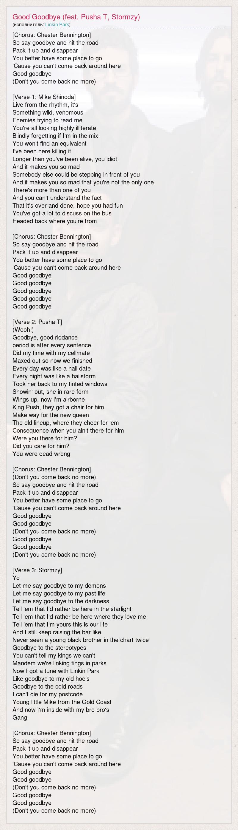 [Chorus: Chester Bennington] So say goodbye and hit the road Pack it up and disappear You better have some place to go 'Cause you can't come back around here Good goodbye (Don't you come back no more) [Verse 1: Mike Shinoda] Live from the rhythm, it's Something wild, venomous Enemies trying to read me You're all looking highly illiterate Blindly forgetting if I'm in the mix You won't find an equivalent I've been here killing it Longer than you've been alive, you idiot And it makes you so mad Somebody else could be stepping in front of you And it makes you so mad that you're not the only one There's more than one of you And you can't understand the fact That it's over and done, hope you had fun You've got a lot to discuss on the bus Headed back where you're from [Chorus: Chester Bennington] So say goodbye and hit the road Pack it up and disappear You better have some place to go 'Cause you can't come back around here Good goodbye Good goodbye Good goodbye Good goodbye Good goodbye [Verse 2: Pusha T] (Wooh!) Goodbye, good riddance period is after every sentence Did my time with my cellmate Maxed out so now we finished Every day was like a hail date Every night was like a hailstorm Took her back to my tinted windows Showin' out, she in rare form Wings up, now I'm airborne King Push, they got a chair for him Make way for the new queen The old lineup, where they cheer for 'em Consequence when you ain't there for him Were you there for him? Did you care for him? You were dead wrong [Chorus: Chester Bennington] (Don't you come back no more) So say goodbye and hit the road Pack it up and disappear You better have some place to go 'Cause you can't come back around here Good goodbye Good goodbye (Don't you come back no more) Good goodbye Good goodbye (Don't you come back no more) [Verse 3: Stormzy] Yo Let me say goodbye to my demons Let me say goodbye to my past life Let me say goodbye to the darkness Tell 'em that I'd rather be here in the starlight Tell 'em that I'd rather be here where they love me Tell 'em that I'm yours this is our life And I still keep raising the bar like Never seen a young black brother in the chart twice Goodbye to the stereotypes You can't tell my kings we can't Mandem we're linking tings in parks Now I got a tune with Linkin Park Like goodbye to my old hoe’s Goodbye to the cold roads I can't die for my postcode Young little Mike from the Gold Coast And now I'm inside with my bro bro's Gang [Chorus: Chester Bennington] So say goodbye and hit the road Pack it up and disappear You better have some place to go 'Cause you can't come back around here Good goodbye Good goodbye (Don't you come back no more) Good goodbye Good goodbye (Don't you come back no more)