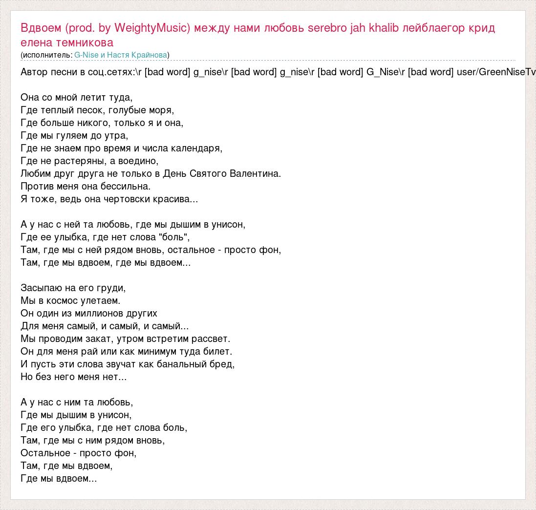 Автор песни в соц.сетях: [bad word] g_nise [bad word] g_nise [bad word] G_Nise [bad word] user/GreenNiseTv Она со мной летит туда, Где теплый песок, голубые моря, Где больше никого, только я и она, Где мы гуляем до утра, Где не знаем про время и числа календаря, Где не растеряны, а воедино, Любим друг друга не только в День Святого Валентина. Против меня она бессильна. Я тоже, ведь она чертовски красива... А у нас с ней та любовь, где мы дышим в унисон, Где ее улыбка, где нет слова "боль", Там, где мы с ней рядом вновь, остальное - просто фон, Там, где мы вдвоем, где мы вдвоем... Засыпаю на его груди, Мы в космос улетаем. Он один из миллионов других Для меня самый, и самый, и самый... Мы проводим закат, утром встретим рассвет. Он для меня рай или как минимум туда билет. И пусть эти слова звучат как банальный бред, Но без него меня нет... А у нас с ним та любовь, Где мы дышим в унисон, Где его улыбка, где нет слова боль, Там, где мы с ним рядом вновь, Остальное - просто фон, Там, где мы вдвоем, Где мы вдвоем...