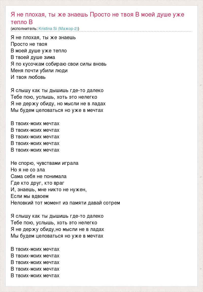 Я не плохая, ты же знаешь Просто не твоя В моей душе уже тепло В