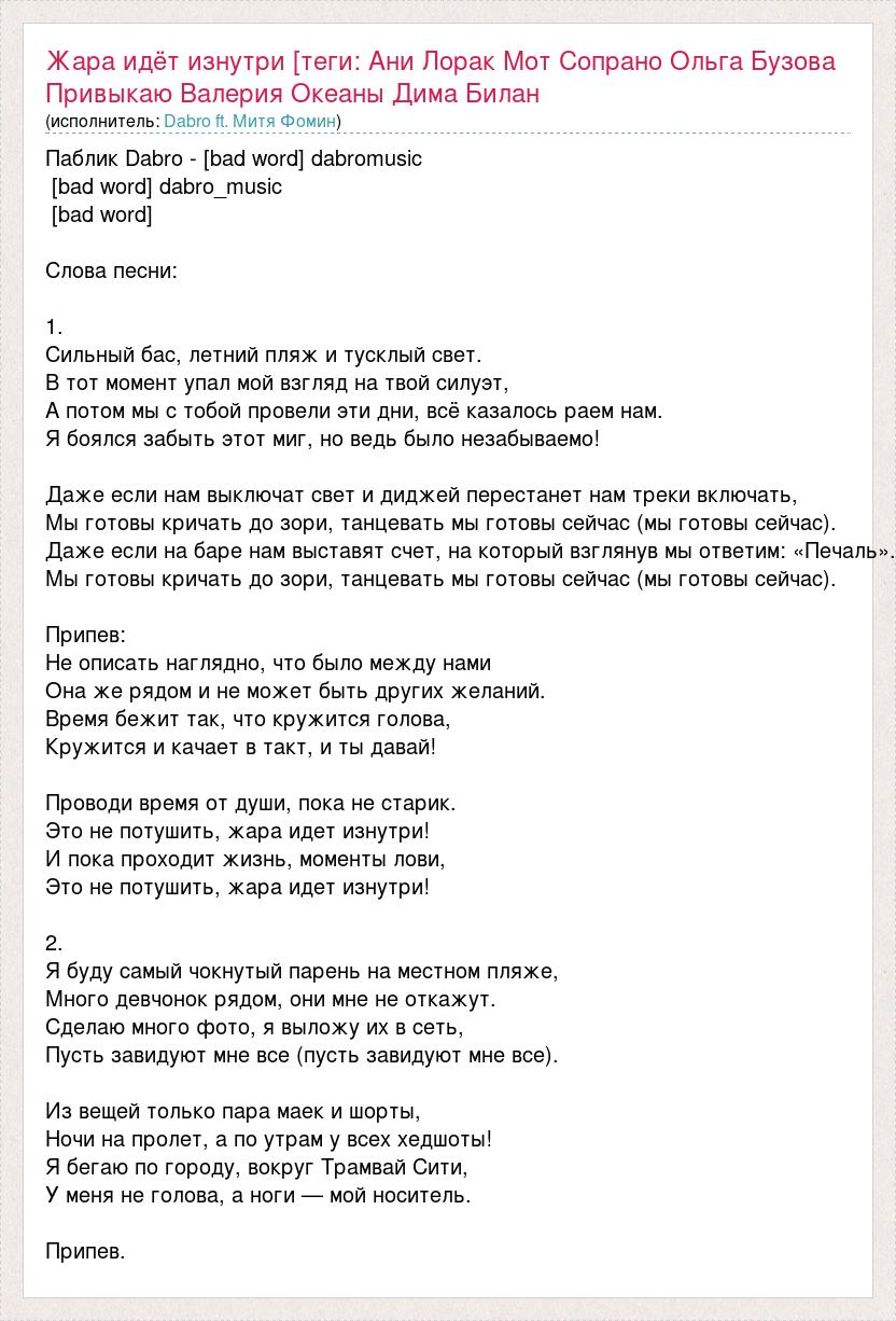 А как ты думаешь, о чем песня "Жара идёт изнутри [теги: Ани Лорак Мот Сопрано Ольга Бузова Привыкаю Валерия Оке" ?