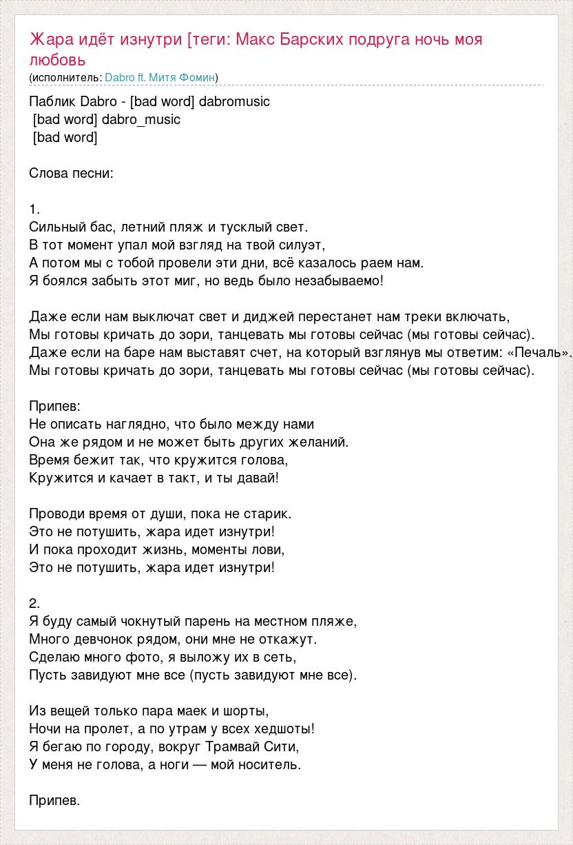Главная→Исполнители→Dabro ft. Митя Фомин→Жара идёт изнутри [теги: Макс Барских подруга ночь моя любовь