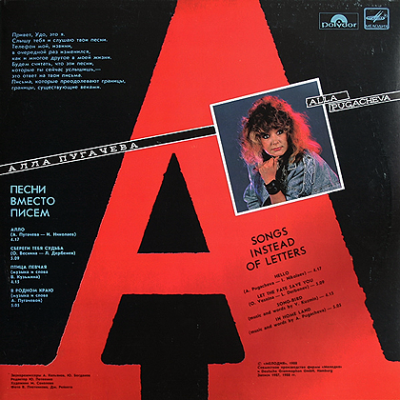 «Песни вместо писем» — совместный альбом Аллы Пугачёвой и западно германского вокалиста Удо Линденберга. Был издан в СССР в 1988 году. Первая сторона пластинки (дорожки 1—5) записана Удо Линденбергом на английском языке, вторая (дорожки 6—9) — Аллой Пугачёвой.