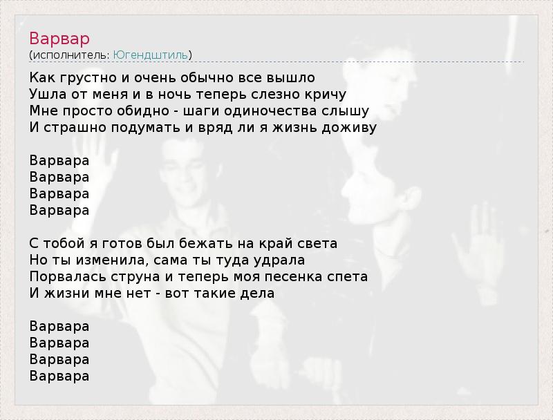 Как грустно и очень обычно все вышло. Ушла от меня и в ночь теперь слезно кричу. Мне просто обидно шаги одиночества слышать. И страшно подумать, и вряд ли я жизнь доживу. Варвара варвара варвара варвара С тобой я готов был бежать на край света, Hо ты изменила сама, ты туда удрала. Порвалась струна и теперь моя песенка спета. И жизни мне нет - вот такие дела Варвара варвара варвара варвара Когда-то был счастлив, а счастье так и ушло. За счастьем несчастье так грустно вот так и пошло. И ждать на крылечке уже бесполезно тебя, Ох как далеко, далеко, далеко от меня ты. Варвара ё-о варвара ё-о варвара ё-о варвара ё-о Варвара ага угу но где ты Варвара ага угу но где ты Варвара ага угу но где ты Варвара ага угу но где ты Варвара ага угу но где ты Варвара ага угу но где ты Варвара ага угу но где ты Варвара ага угу но где ты Варвара ага угу но где ты Варвара ага угу но где ты