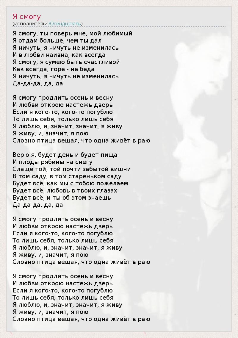 Я смогу, ты поверь мне, мой любимый Я отдам больше, чем ты дал Я ничуть, я ничуть не изменилась И в любви наивна, как всегда Я смогу, я сумею быть счастливой Как всегда, горе - не беда Я ничуть, я ничуть не изменилась Да-да-да, да, да Я смогу продлить осень и весну И любви открою настежь дверь Если я кого-то, кого-то погублю То лишь себя, только лишь себя Я люблю, и, значит, значит, я живу Я живу, и, значит, я пою Словно птица вещая, что одна живёт в раю Верю я, будет день и будет пища И плоды рябины на снегу Слаще той, той почти забытой вишни В том саду, в том стареньком саду Будет всё, как мы с тобою пожелаем Будет всё, любовь в твоих глазах Будет всё, и ты об этом знаешь Да-да-да, да, да Я смогу продлить осень и весну И любви открою настежь дверь Если я кого-то, кого-то погублю То лишь себя, только лишь себя Я люблю, и, значит, значит, я живу Я живу, и, значит, я пою Словно птица вещая, что одна живёт в раю Я смогу продлить осень и весну И любви открою настежь дверь Если я кого-то, кого-то погублю То лишь себя, только лишь себя Я люблю, и, значит, значит, я живу Я живу, и, значит, я пою Словно птица вещая, что одна живёт в раю