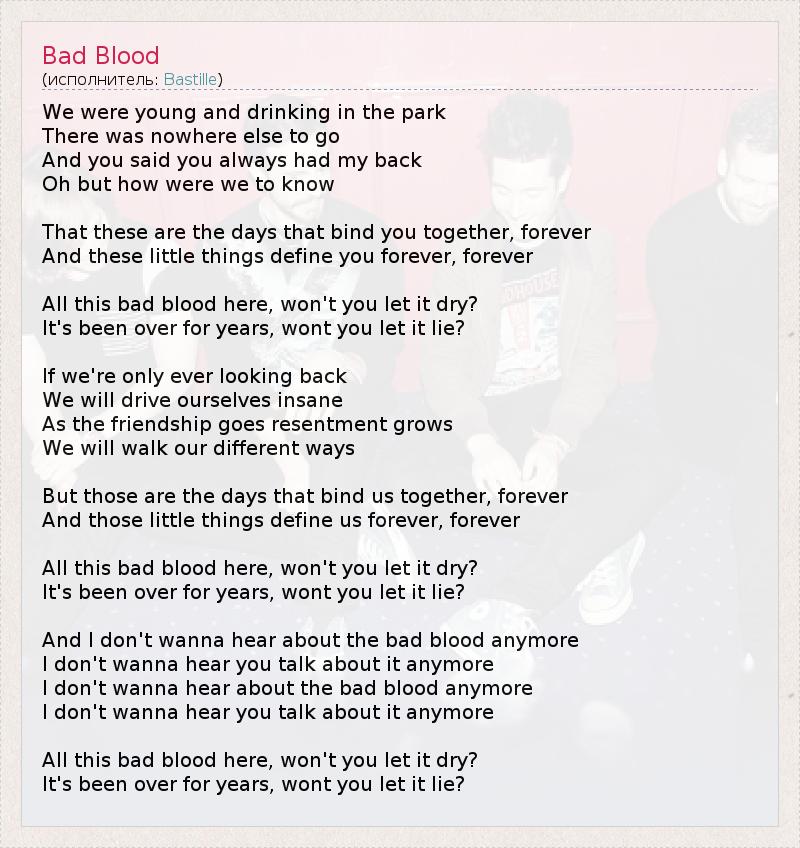 We were young and drinking in the park There was nowhere else to go And you said you always had my back Oh but how were we to know That these are the days that bind you together, forever And these little things define you forever, forever All this bad blood here, won't you let it dry? It's been over for years, wont you let it lie? If we're only ever looking back We will drive ourselves insane As the friendship goes resentment grows We will walk our different ways But those are the days that bind us together, forever And those little things define us forever, forever All this bad blood here, won't you let it dry? It's been over for years, wont you let it lie? And I don't wanna hear about the bad blood anymore I don't wanna hear you talk about it anymore I don't wanna hear about the bad blood anymore I don't wanna hear you talk about it anymore All this bad blood here, won't you let it dry? It's been over for years, wont you let it lie?