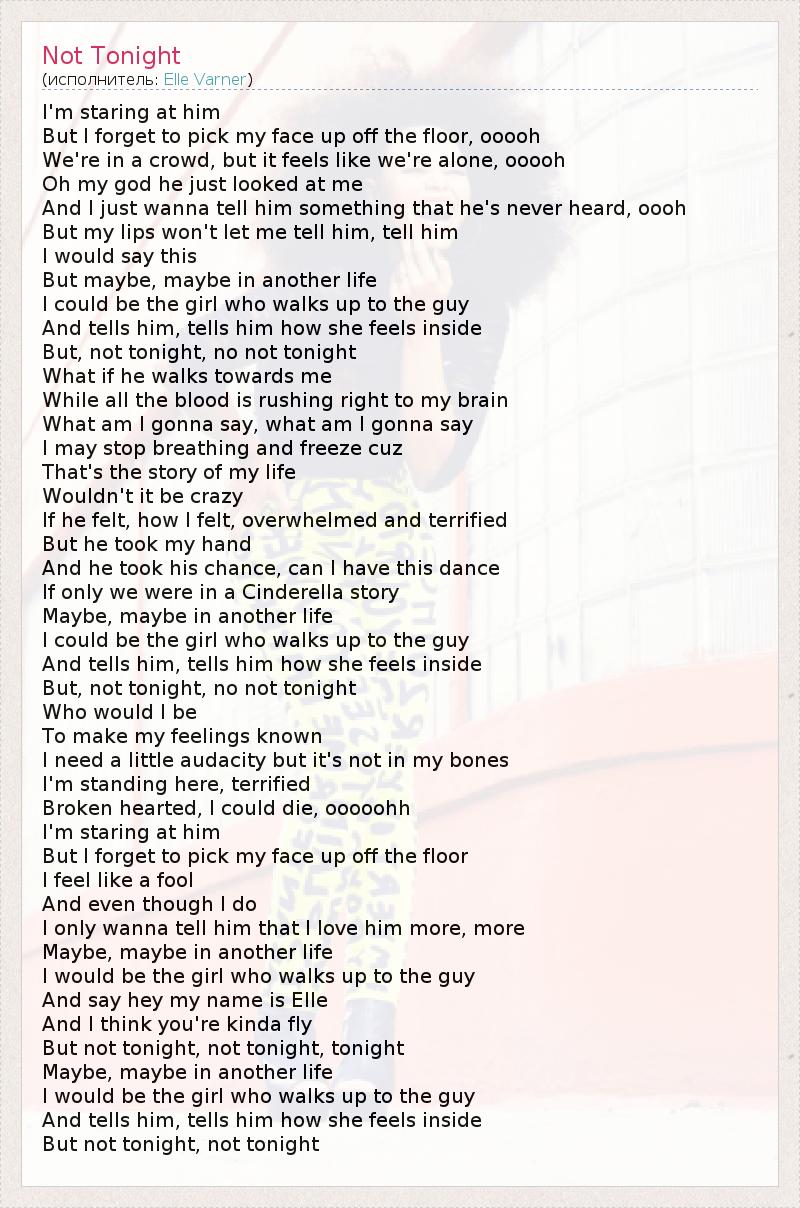 I'm staring at him But I forget to pick my face up off the floor, ooooh We're in a crowd, but it feels like we're alone, ooooh Oh my god he just looked at me And I just wanna tell him something that he's never heard, oooh But my lips won't let me tell him, tell him I would say this But maybe, maybe in another life I could be the girl who walks up to the guy And tells him, tells him how she feels inside But, not tonight, no not tonight What if he walks towards me While all the blood is rushing right to my brain What am I gonna say, what am I gonna say I may stop breathing and freeze cuz That's the story of my life Wouldn't it be crazy If he felt, how I felt, overwhelmed and terrified But he took my hand And he took his chance, can I have this dance If only we were in a Cinderella story Maybe, maybe in another life I could be the girl who walks up to the guy And tells him, tells him how she feels inside But, not tonight, no not tonight Who would I be To make my feelings known I need a little audacity but it's not in my bones I'm standing here, terrified Broken hearted, I could die, ooooohh I'm staring at him But I forget to pick my face up off the floor I feel like a fool And even though I do I only wanna tell him that I love him more, more Maybe, maybe in another life I would be the girl who walks up to the guy And say hey my name is Elle And I think you're kinda fly But not tonight, not tonight, tonight Maybe, maybe in another life I would be the girl who walks up to the guy And tells him, tells him how she feels inside But not tonight, not tonight