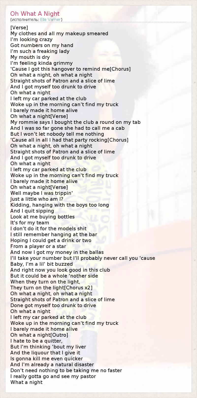 [Verse] My clothes and all my makeup smeared I'm looking crazy Got numbers on my hand I'm such a freaking lady My mouth is dry I'm feeling kinda grimmy 'Cause I got this hangover to remind me[Chorus] Oh what a night, oh what a night Straight shots of Patron and a slice of lime And I got myself too drunk to drive Oh what a night I left my car parked at the club Woke up in the morning can't find my truck I barely made it home alive Oh what a night[Verse] My rommie says I bought the club a round on my tab And I was so far gone she had to call me a cab But I won't let nobody tell me nothing 'Cause all in all I had that party rocking[Chorus] Oh what a night, oh what a night Straight shots of Patron and a slice of lime And I got myself too drunk to drive Oh what a night I left my car parked at the club Woke up in the morning can't find my truck I barely made it home alive Oh what a night[Verse] Well maybe I was trippin' Just a little who am I? Kidding, hanging with the boys too long And I quit sipping Look at me buying bottles It's for my team I don't do it for the models shit I still remember hanging at the bar Hoping I could get a drink or two From a player or a star And now I got my money in the ballas I'll take your number but I'll probably never call you 'cause Baby, I'm a lil' bit buzzed And right now you look good in this club But it could be a whole 'nother side When they turn on the light, They turn on the light[Chorus x2] Oh what a night, oh what a night Straight shots of Patron and a slice of lime Done got myself too drunk to drive Oh what a night I left my car parked at the club Woke up in the morning can't find my truck I barely made it home alive Oh what a night[Outro] I hate to be a quitter, But I'm thinking 'bout my liver And the liquour that I give it Is gonna kill me even quicker And I'm already a natural disaster Don't need nothing to be taking me no faster I really gotta go and see my pastor What a night