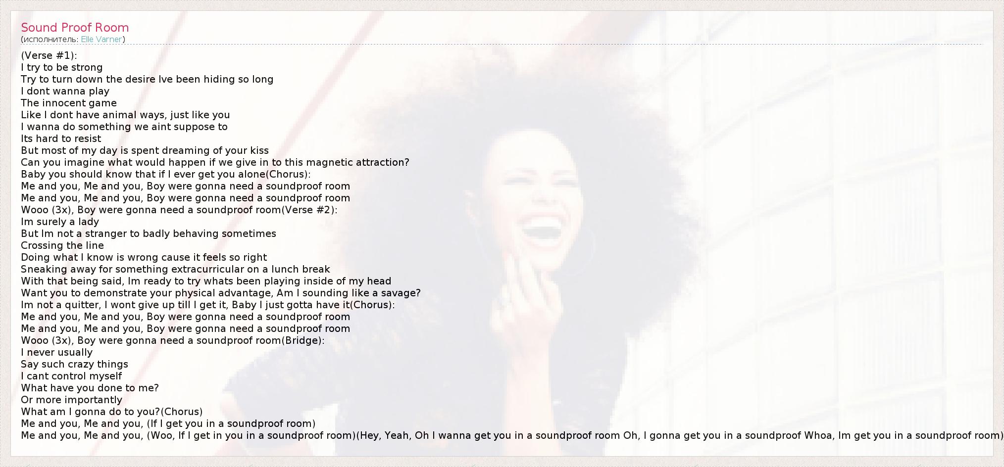 (Verse #1): I try to be strong Try to turn down the desire Ive been hiding so long I dont wanna play The innocent game Like I dont have animal ways, just like you I wanna do something we aint suppose to Its hard to resist But most of my day is spent dreaming of your kiss Can you imagine what would happen if we give in to this magnetic attraction? Baby you should know that if I ever get you alone(Chorus): Me and you, Me and you, Boy were gonna need a soundproof room Me and you, Me and you, Boy were gonna need a soundproof room Wooo (3x), Boy were gonna need a soundproof room(Verse #2): Im surely a lady But Im not a stranger to badly behaving sometimes Crossing the line Doing what I know is wrong cause it feels so right Sneaking away for something extracurricular on a lunch break With that being said, Im ready to try whats been playing inside of my head Want you to demonstrate your physical advantage, Am I sounding like a savage? Im not a quitter, I wont give up till I get it, Baby I just gotta have it(Chorus): Me and you, Me and you, Boy were gonna need a soundproof room Me and you, Me and you, Boy were gonna need a soundproof room Wooo (3x), Boy were gonna need a soundproof room(Bridge): I never usually Say such crazy things I cant control myself What have you done to me? Or more importantly What am I gonna do to you?(Chorus) Me and you, Me and you, (If I get you in a soundproof room) Me and you, Me and you, (Woo, If I get in you in a soundproof room)(Hey, Yeah, Oh I wanna get you in a soundproof room Oh, I gonna get you in a soundproof Whoa, Im get you in a soundproof room)