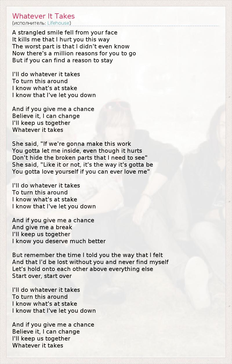 A strangled smile fell from your face It kills me that I hurt you this way The worst part is that I didn't even know Now there's a million reasons for you to go But if you can find a reason to stay I'll do whatever it takes To turn this around I know what's at stake I know that I've let you down And if you give me a chance Believe it, I can change I'll keep us together Whatever it takes She said, "If we're gonna make this work You gotta let me inside, even though it hurts Don't hide the broken parts that I need to see" She said, "Like it or not, it's the way it's gotta be You gotta love yourself if you can ever love me" I'll do whatever it takes To turn this around I know what's at stake I know that I've let you down And if you give me a chance And give me a break I'll keep us together I know you deserve much better But remember the time I told you the way that I felt And that I'd be lost without you and never find myself Let's hold onto each other above everything else Start over, start over I'll do whatever it takes To turn this around I know what's at stake I know that I've let you down And if you give me a chance Believe it, I can change I'll keep us together Whatever it takes