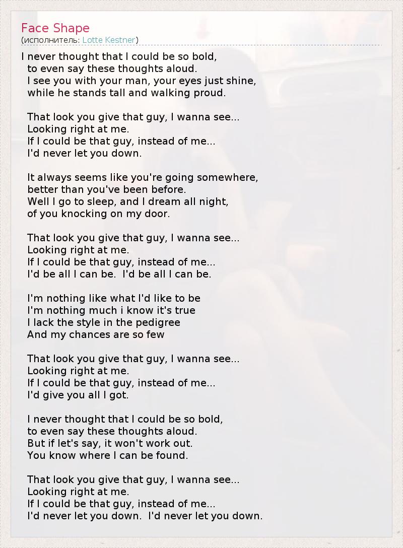 I never thought that I could be so bold, to even say these thoughts aloud. I see you with your man, your eyes just shine, while he stands tall and walking proud. That look you give that guy, I wanna see... Looking right at me. If I could be that guy, instead of me... I'd never let you down. It always seems like you're going somewhere, better than you've been before. Well I go to sleep, and I dream all night, of you knocking on my door. That look you give that guy, I wanna see... Looking right at me. If I could be that guy, instead of me... I'd be all I can be. I'd be all I can be. I'm nothing like what I'd like to be I'm nothing much i know it's true I lack the style in the pedigree And my chances are so few That look you give that guy, I wanna see... Looking right at me. If I could be that guy, instead of me... I'd give you all I got. I never thought that I could be so bold, to even say these thoughts aloud. But if let's say, it won't work out. You know where I can be found. That look you give that guy, I wanna see... Looking right at me. If I could be that guy, instead of me... I'd never let you down. I'd never let you down.