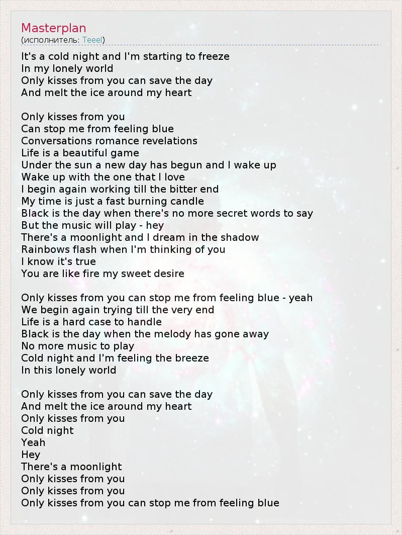 Ночь холодна, и я начинаю замерзать В своем одиноком мире, Только твои поцелуи могут спасти положение И растопить лед вокруг моего сердца. Только твои поцелуи Могут помешать мне унывать. Беседы о романтических откровениях, Жизнь - красивая игра. Под солнцем начался новый день, и я просыпаюсь, Просыпаюсь с той, которую люблю. Я начинаю снова работать до самого конца, Мое время - только быстро горящая свеча. Мрачен день, когда нет больше тайных слов, Но музыка зазвучит, эй! Светит луна, и я мечтаю в тени, Вспыхивают радуги, когда я думаю о тебе, Я знаю, что это правда, Ты как огонь, моя сладкая страсть. Только твои поцелуи могут помешать мне унывать – да, Мы начинаем снова стараться до самого конца. С жизнью тяжело справляться, День, когда мелодия ушла, - черный, Нет больше музыки, чтобы играть Холодной ночью, и я чувствую легкий ветер В этом одиноком мире. Только твои поцелуи могут спасти положение И растопить лед вокруг моего сердца, Только твои поцелуи, Холодной ночью, Да. Эй, Светит луна, Только твои поцелуи, Только твои поцелуи, Только твои поцелуи могут помешать мне унывать.